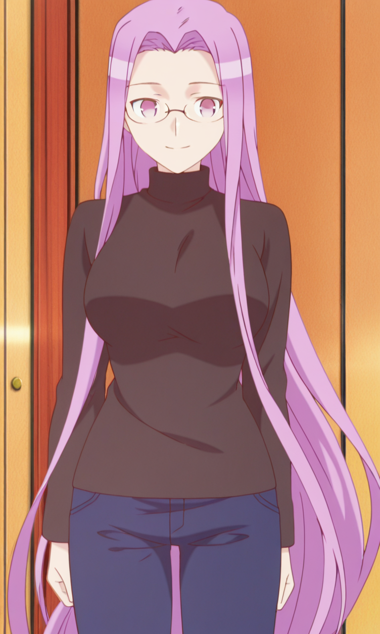 Medusa,1girl,solo,purple hair, long hair,purple eyes,turtleneck,black sweater, turtleneck,long sleeves, blue pants