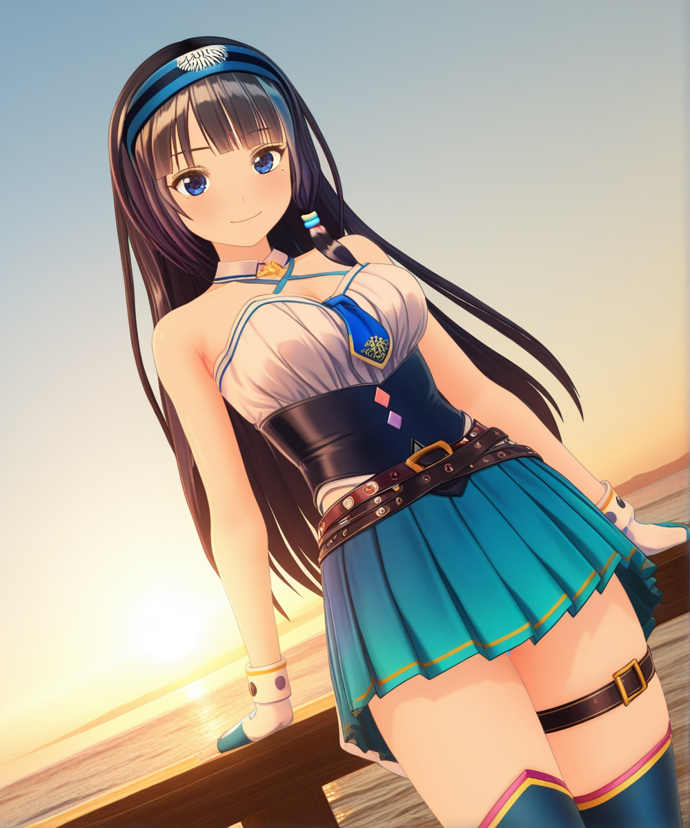 fuji aoi,multicolored hair,hair band,long hair,ober knee socks,blue long hair,thighhighs,gloves,bare shoulders,necktie,