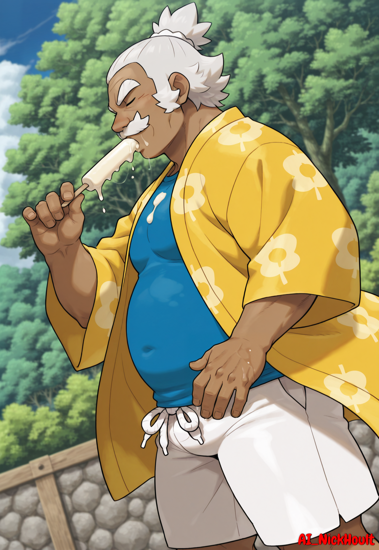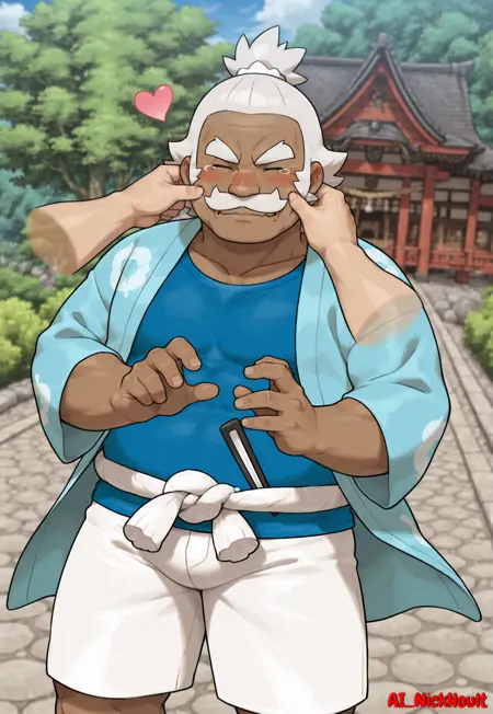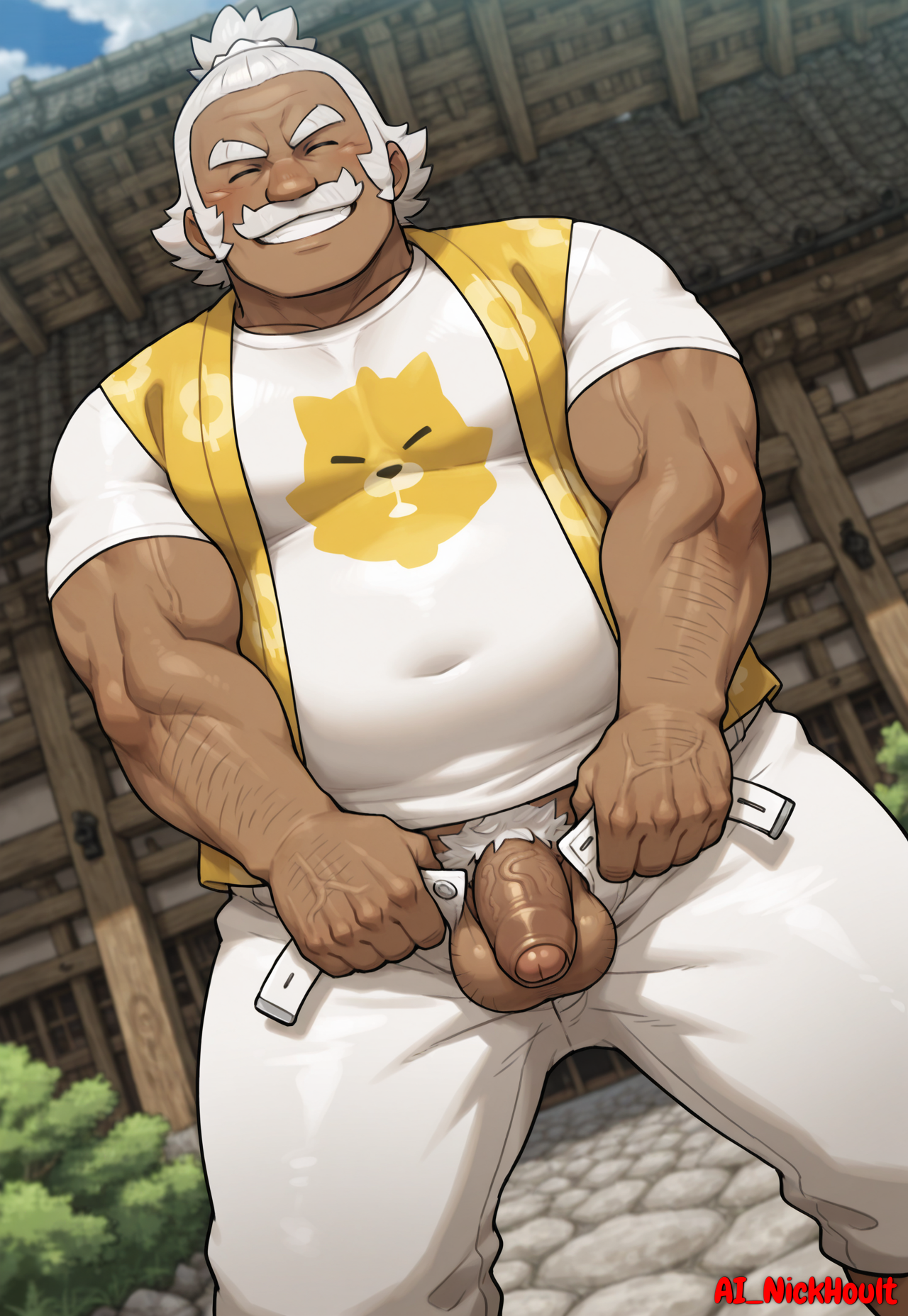 Hala, old man, chubby, muscular build, dark skin, spiky white hair, moustache, closed eyes,