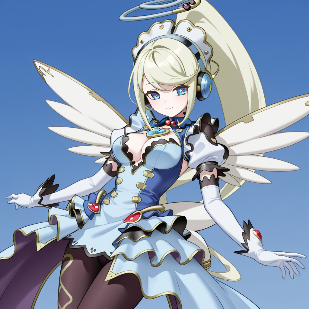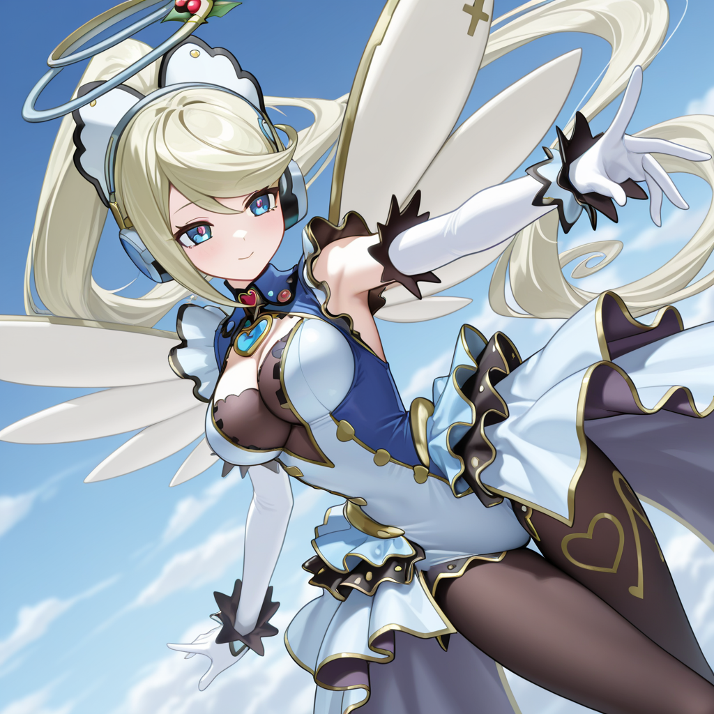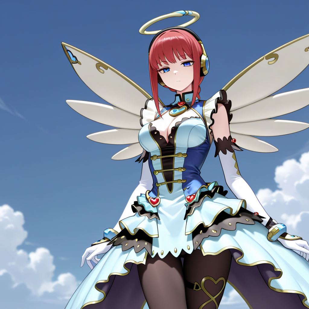 미래형 환상, 헤드폰, 금속 헤어 장식, 하트 목걸이, 팔꿈치 장갑, 흰 장갑, 트릭스타 드레스, 팬티스타킹