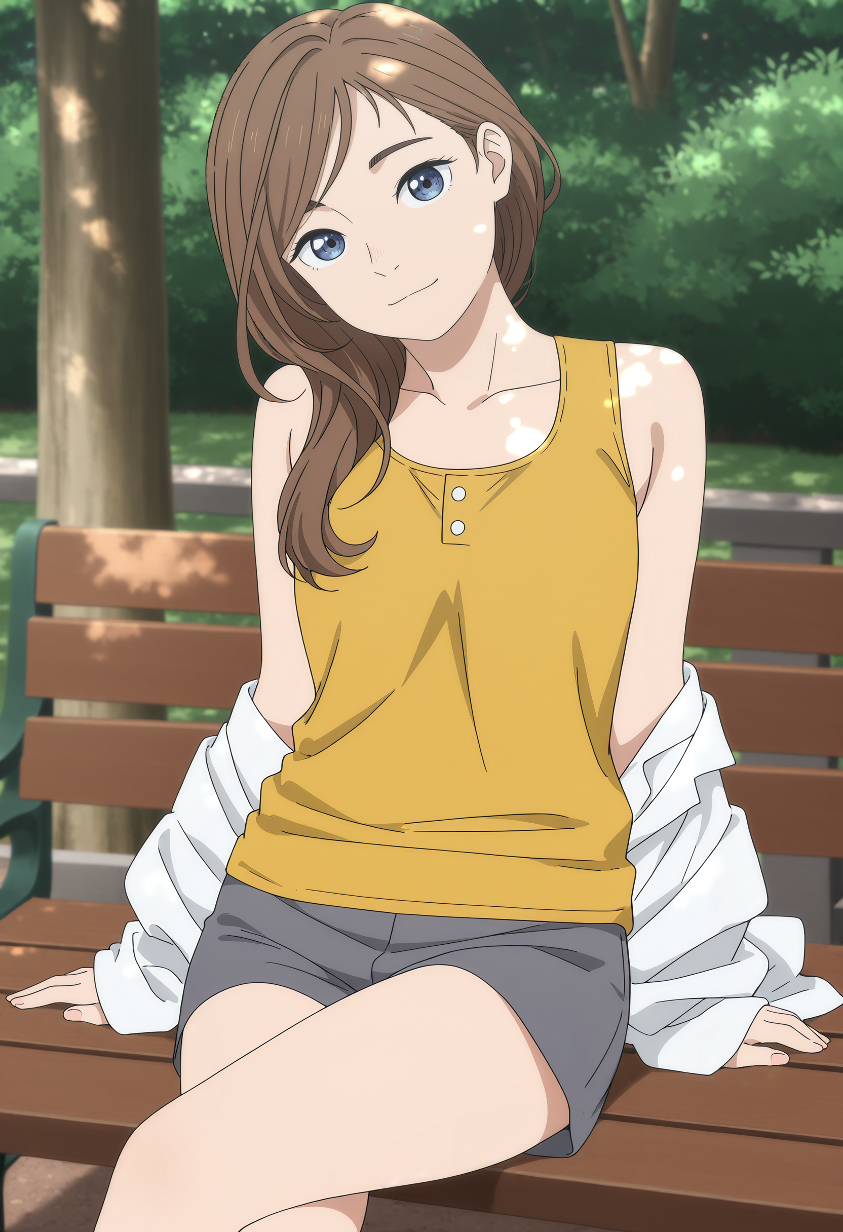#1: white shirt, long sleeves, off shoulder, yellow tank top, grey shorts, short shorts, red footwear, slip-on shoes