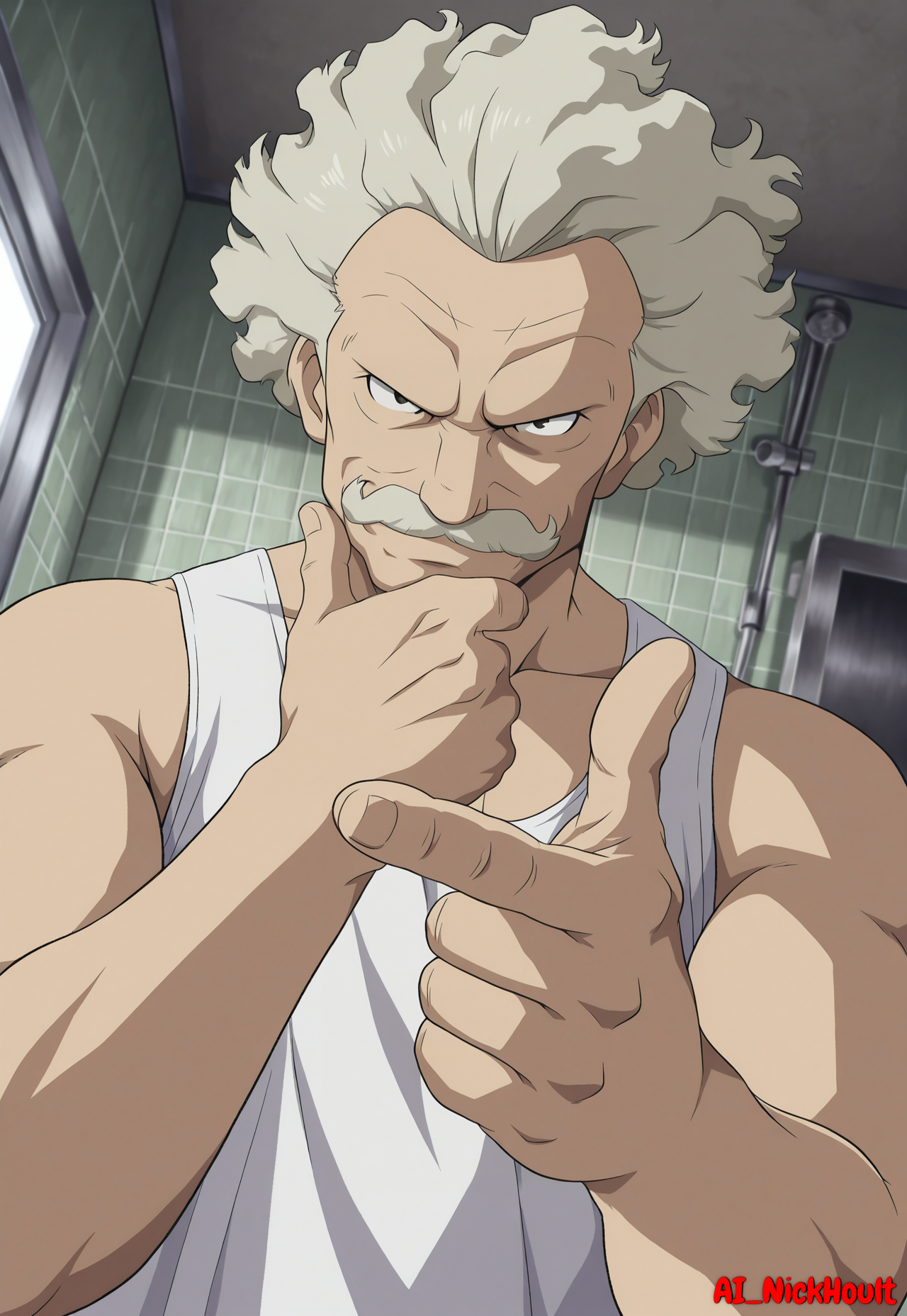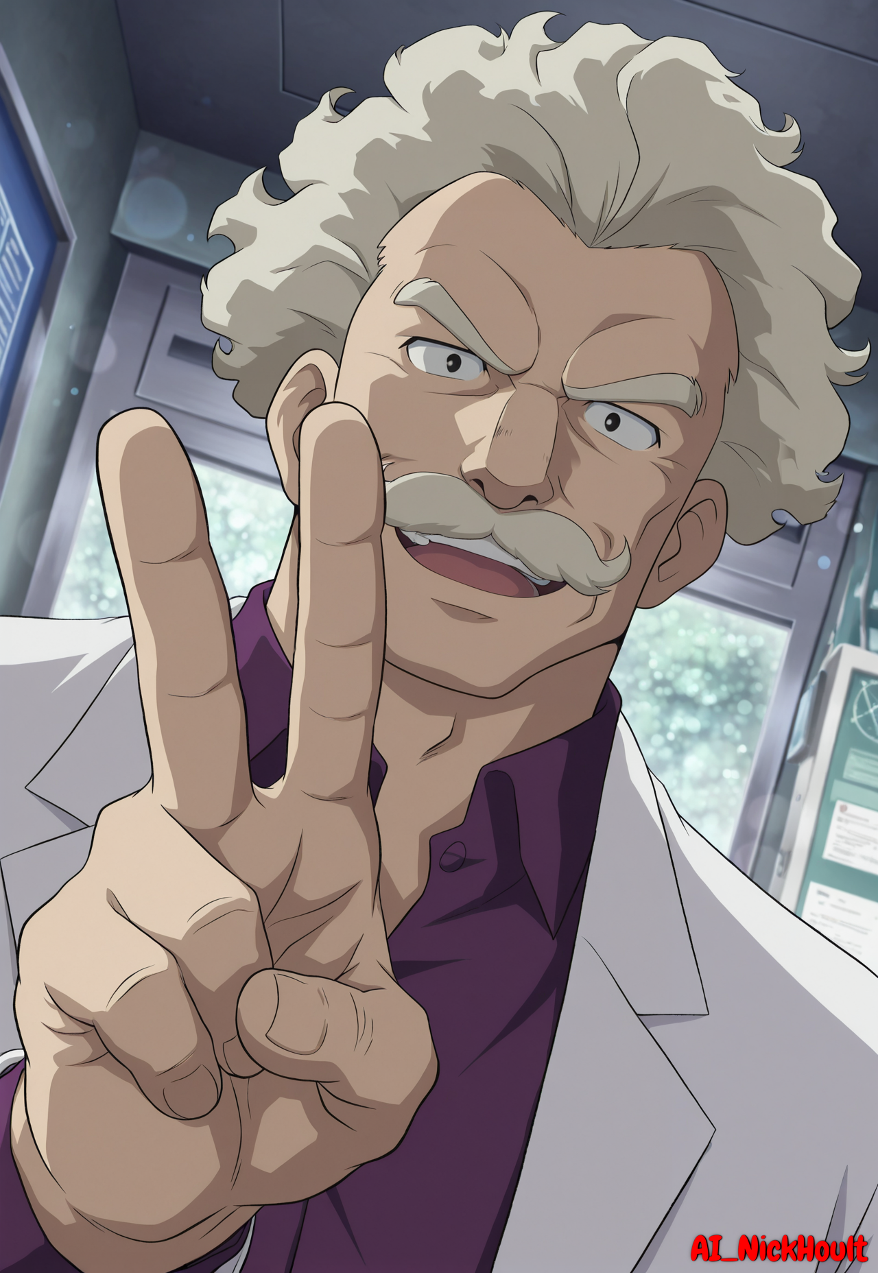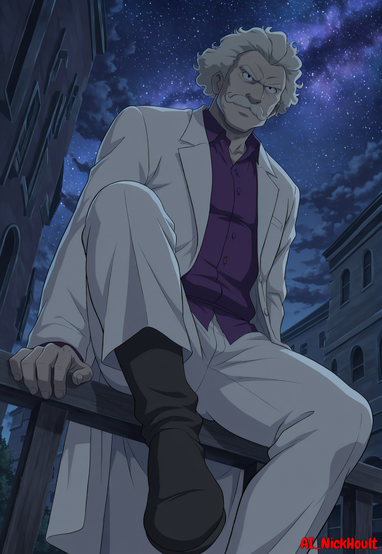 Doctor_Zager, old man, white frizzy hair, moustache, pale skin, black eyes,