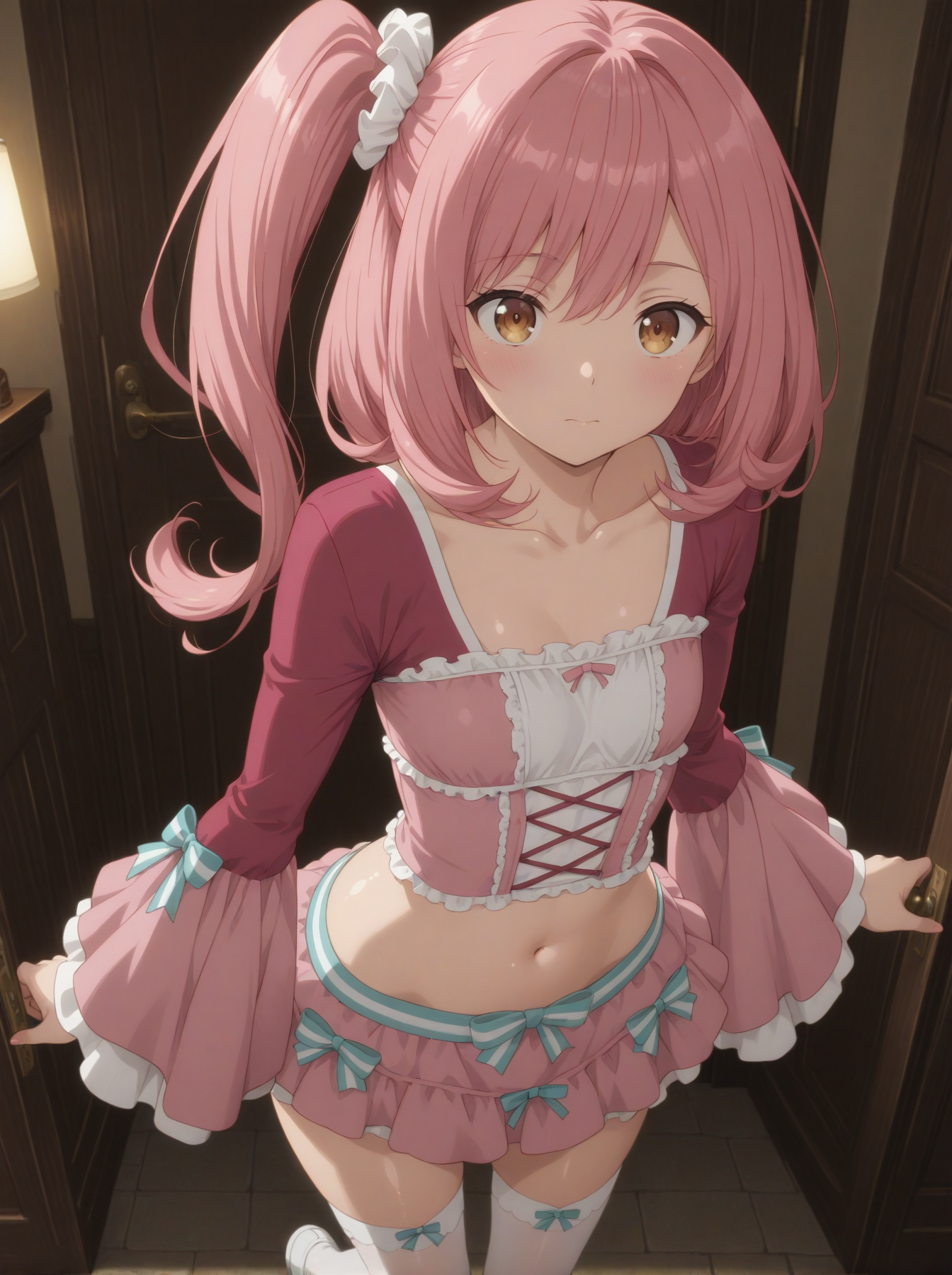 옷: (셔츠, 리본, 넓고 긴 소매, 관자놀이, 배꼽 드러난 상의, 미니스커트, 분홍색 허벅지 양말, 흰색 신발)