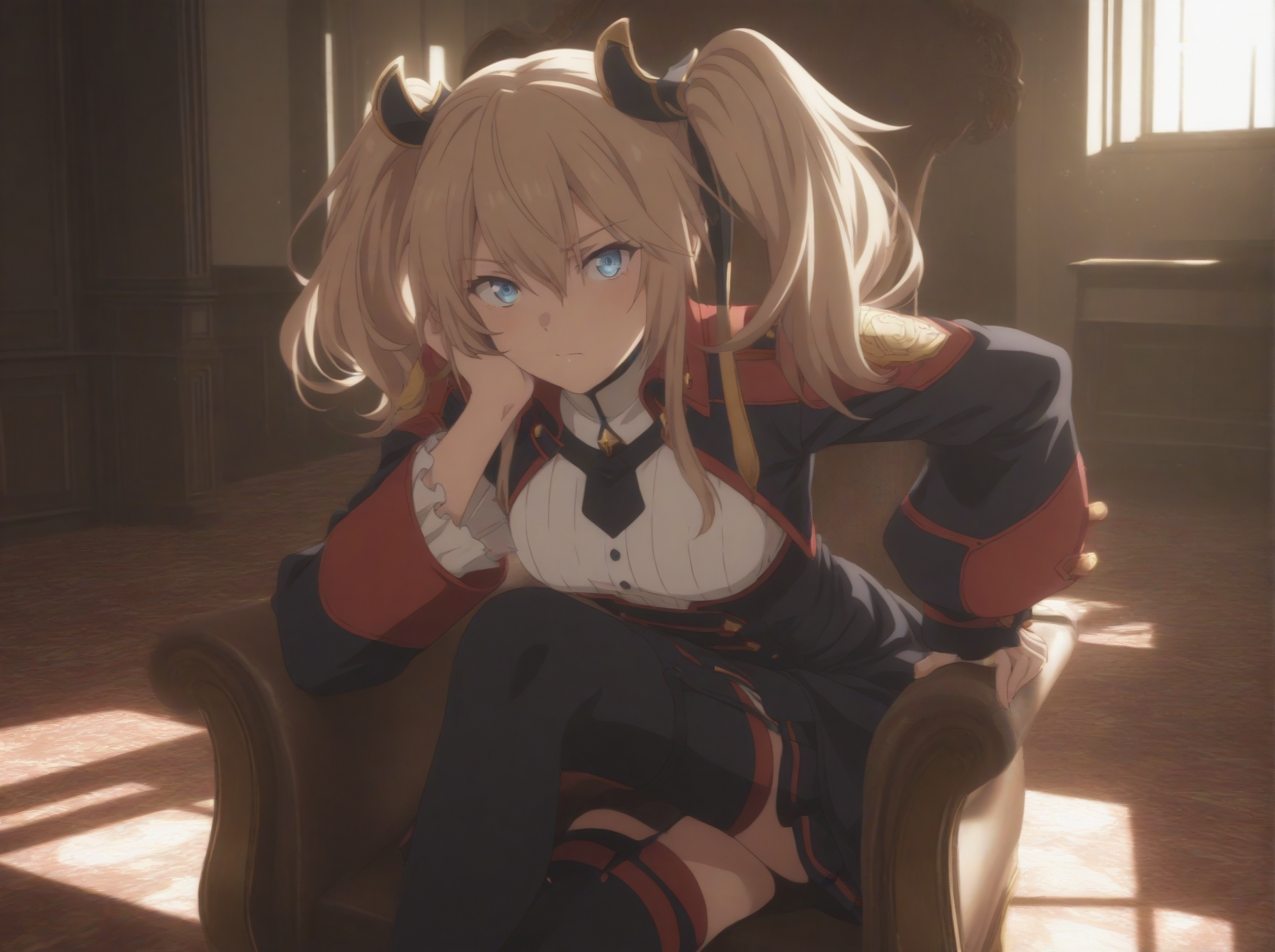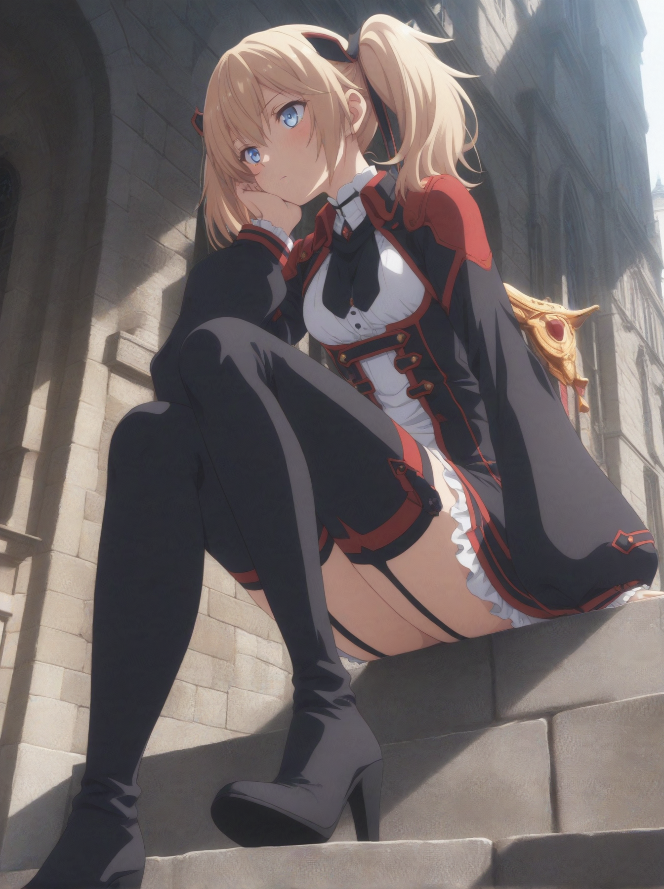 옷: 드레스, (흰색 가슴), 빨간 테두리, 검은 치마, 짧은 드레스, 높은 칼라, 긴 소매, 검은 허벅지 스타킹, 허벅지 스트랩, 하이힐 부츠)
