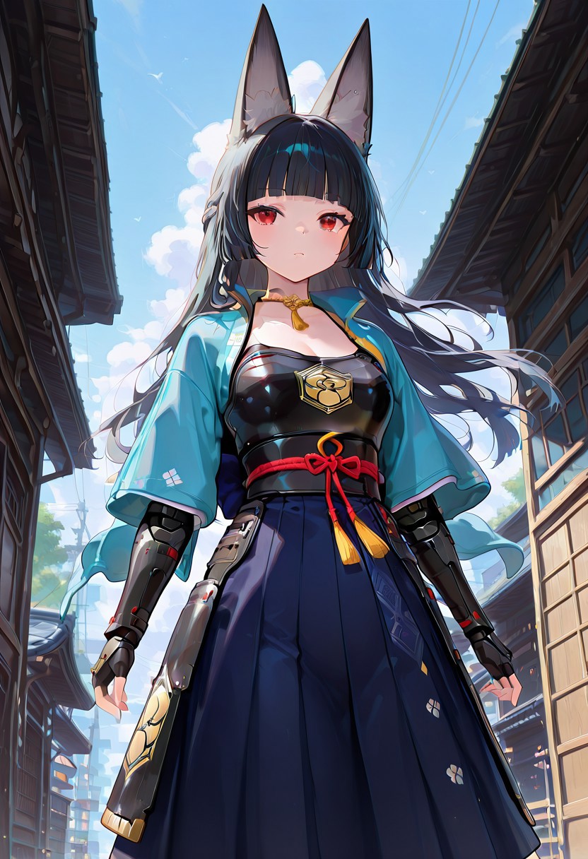 kmstoykclstyl, japanese clothes, armored dress, light blue jacket, dark blue hakama, hakama skirt, armored dress,black dress, arm guards, breastplate, gloves, fingerless gloves,
