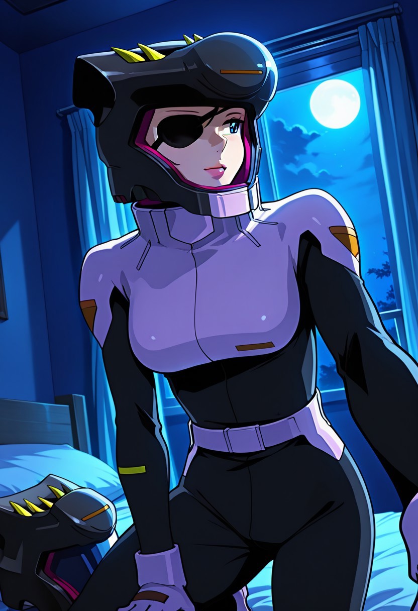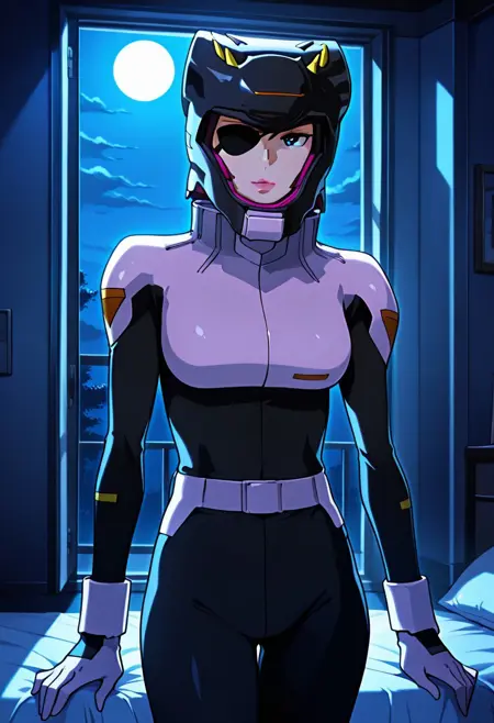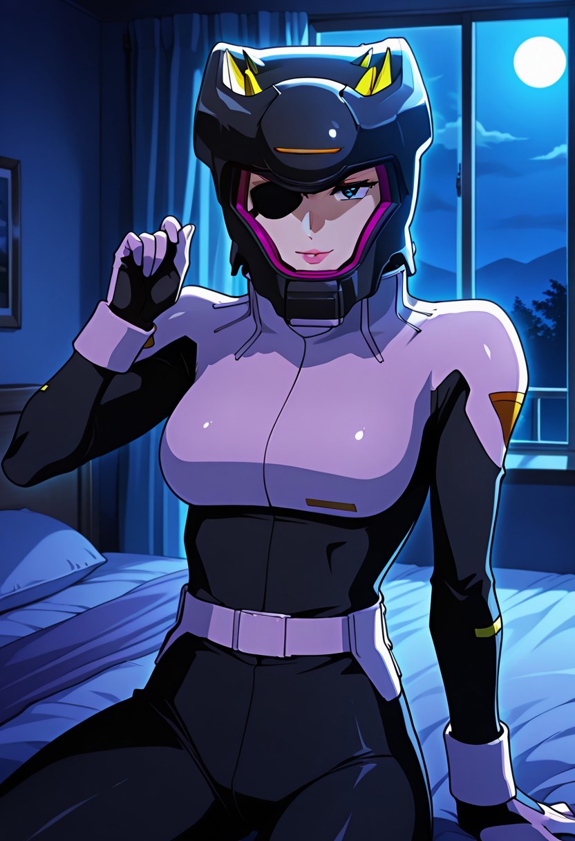 힐다, 1명의 여성, 주황색 머리카락, 단발머리, 눈가리개, 검은 눈, 분홍색 입술