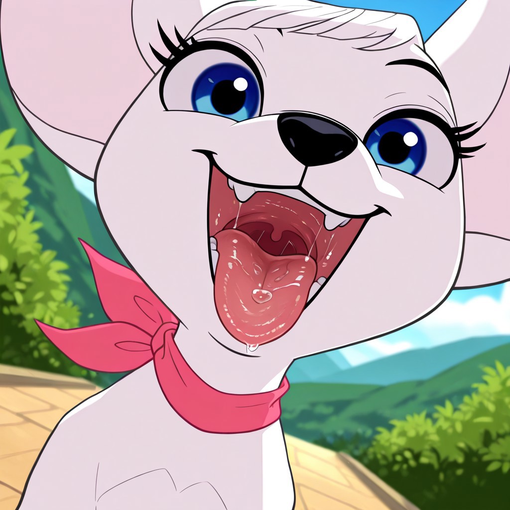 dog, chihuahua, white fur, bangs, blue eyes, large ears, black nose, dog tail, pink scarf,