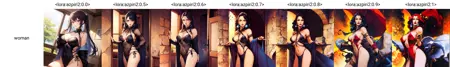 흥미로운 점은, 0.81의 강도로 사용 시 완전히 아스피리 스타일이지만, 그 아래의 0.60.8의 강도에서는 더 부드럽고 더 세밀한 서양 스타일이 섞이는 것을 볼 수 있습니다. 하나의 이미지에서 다양한 LoRA 강도를 비교해볼 수 있습니다.