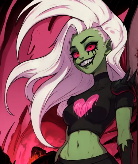 带黄色角的头盔、黑色上衣配粉色心形图案、露脐、肩甲、黄色手套或黄色臂甲、尖刺、黑色骨盆帘幕或长黑裙,