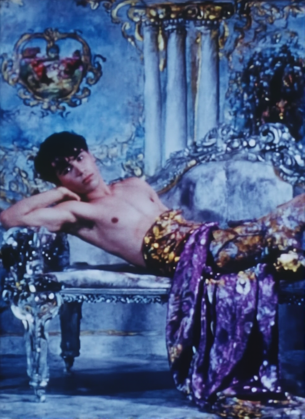 『ピンク・ナルキッサス』は、すべて手作業で制作されたファンタジー的なセット、濃密な投影照明、そして男性の体を物語の主体ではなく、装飾的・象徴的な対象として夢幻的に演出するという点で、地下アート映画の画期的作品です。ビドグッドはほぼ単独で、ベルベットのカーテン、人工的な花、神話的な背景、劇的な色の領域に満ちた精巧なミニチュア世界を構築し、密な身体の存在を豊かで儀礼的なテーブルー(絵画的構成)へと変容させました。彼の美学は、身体、装飾、光の境界を溶かし込み、物理的な場所というより、内面的な夢の空間のように感じるシーンを生み出します。