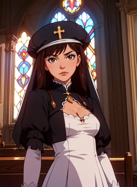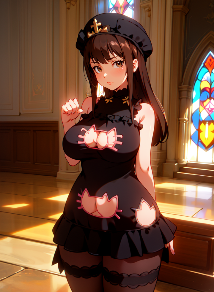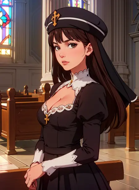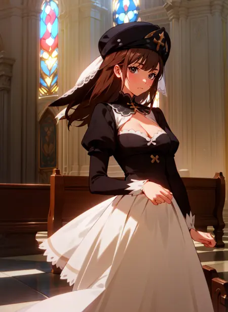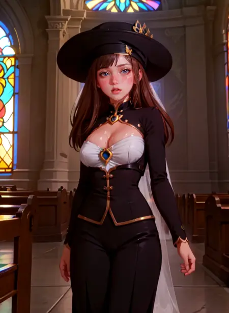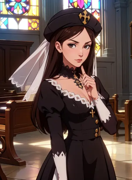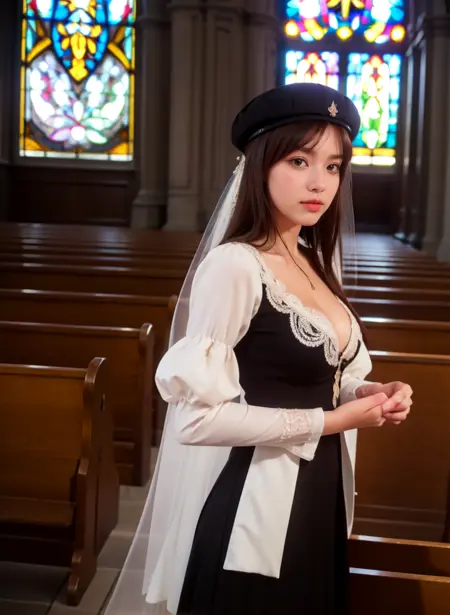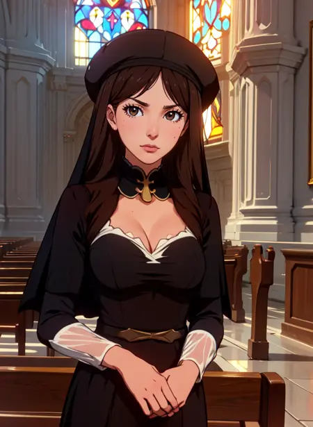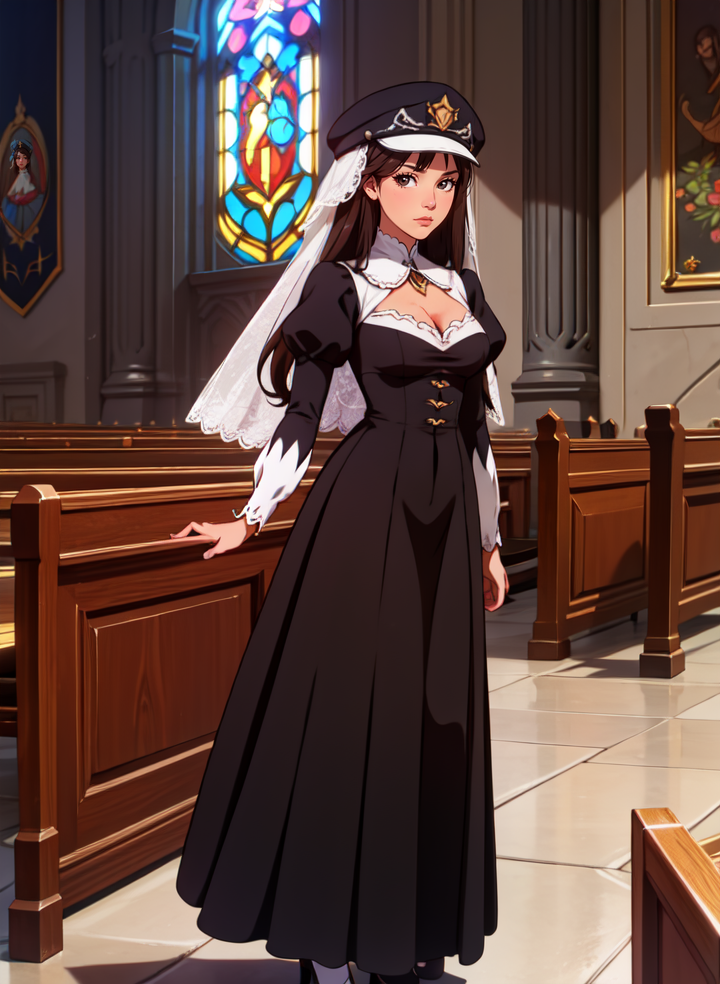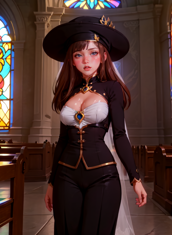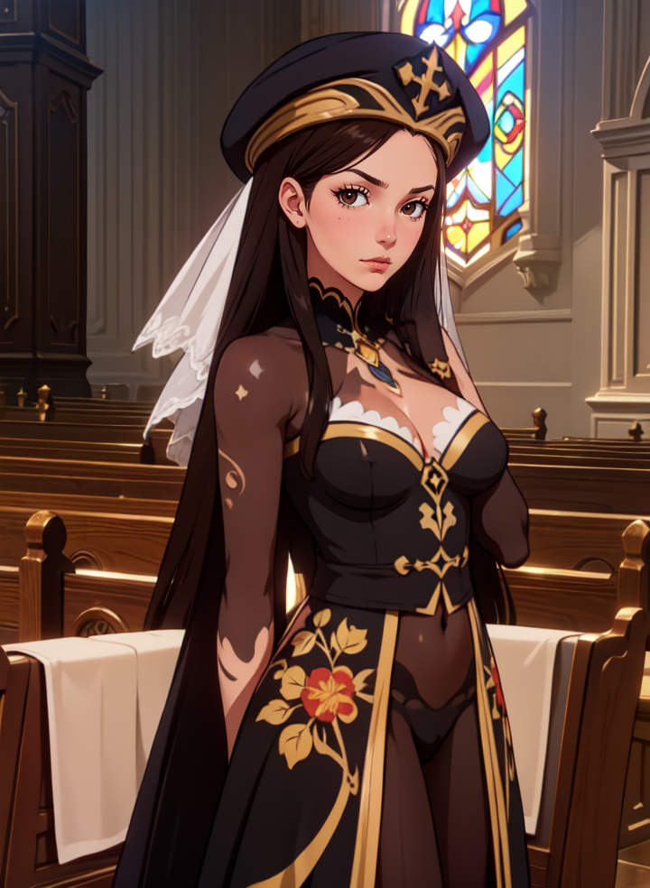 (masterpiece, best quality),(depth) of (field), lora:VictoriaNPC:0.8 cold_expression, 1girl, black_clothes, dress, brown_hair, cleavage, ornaments, puffy_sleeves,veil, church, hat, dandelions scattered in the air, wind, breeze, looking_at_viewer, adult