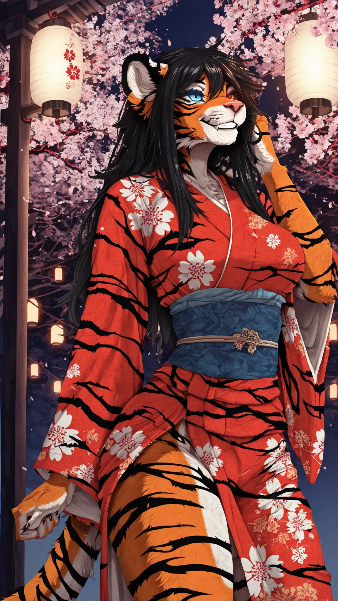 Azyra,anthro tiger,white fur trim,heterochromia, blue eye, red eye,caracal ears,tufted ears,striped fur pattern,long tail