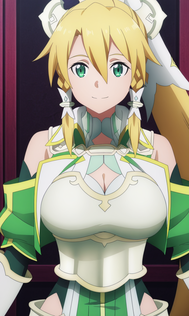 leafa(sao), 1소녀, 싱글, 긴 머리, 금발, 눈 사이의 머리카락, 녹색 눈, 꼬리머리, 땋은 머리, 쌍 땋은 머리, 어깨 노출, 분리된 소매, 장갑, 흰 장갑, 드레스, 녹색 드레스