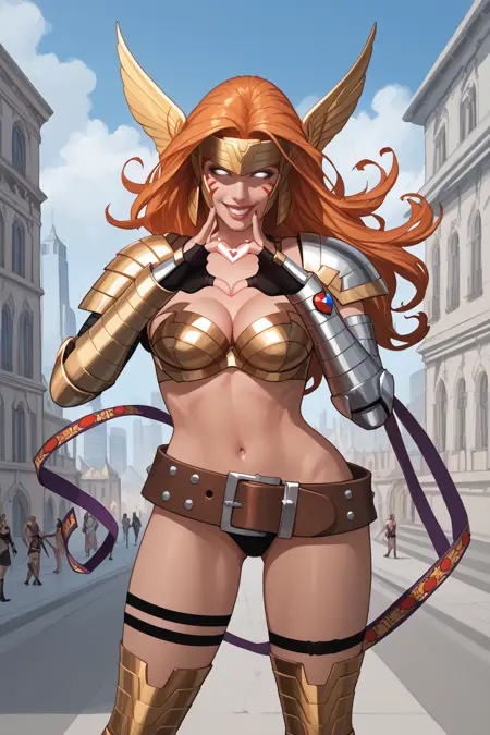 - レトロトリガー:angela, 長い髪, 額のプロテクター, 翼付きヘルメット, 白い目, 瞳なし, ピアス, ストリーマー:1.5, マスク, 胸元, ビキニ, 片肩のパッド, 肩を露出, (黒い肘手袋、黒い腕), 腕に巻かれたレザーのストラップ, 盆骨カーテン, 腹部, 大きなベルト, ルーズなベルト, 太ももストラップ, ブーツ, 黒いブレスレット