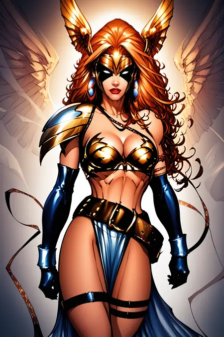 - モダントリガー:angela, 長い髪, 額のプロテクター, 翼付きヘルメット, 白い目, 瞳なし, 赤い顔のペイント, ストリーマー, 胸元, ビキニアーマー, パウルドロン, ガントレット, ブレイサー, 腹部, 大きなベルト, ルーズなベルト, パンツ, 太ももストラップ, ブーツ