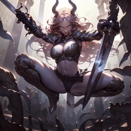 - モダントリガー:angela, 長い髪, 額のプロテクター, 翼付きヘルメット, 白い目, 瞳なし, 赤い顔のペイント, ストリーマー, 胸元, ビキニアーマー, パウルドロン, ガントレット, ブレイサー, 腹部, 大きなベルト, ルーズなベルト, パンツ, 太ももストラップ, ブーツ
