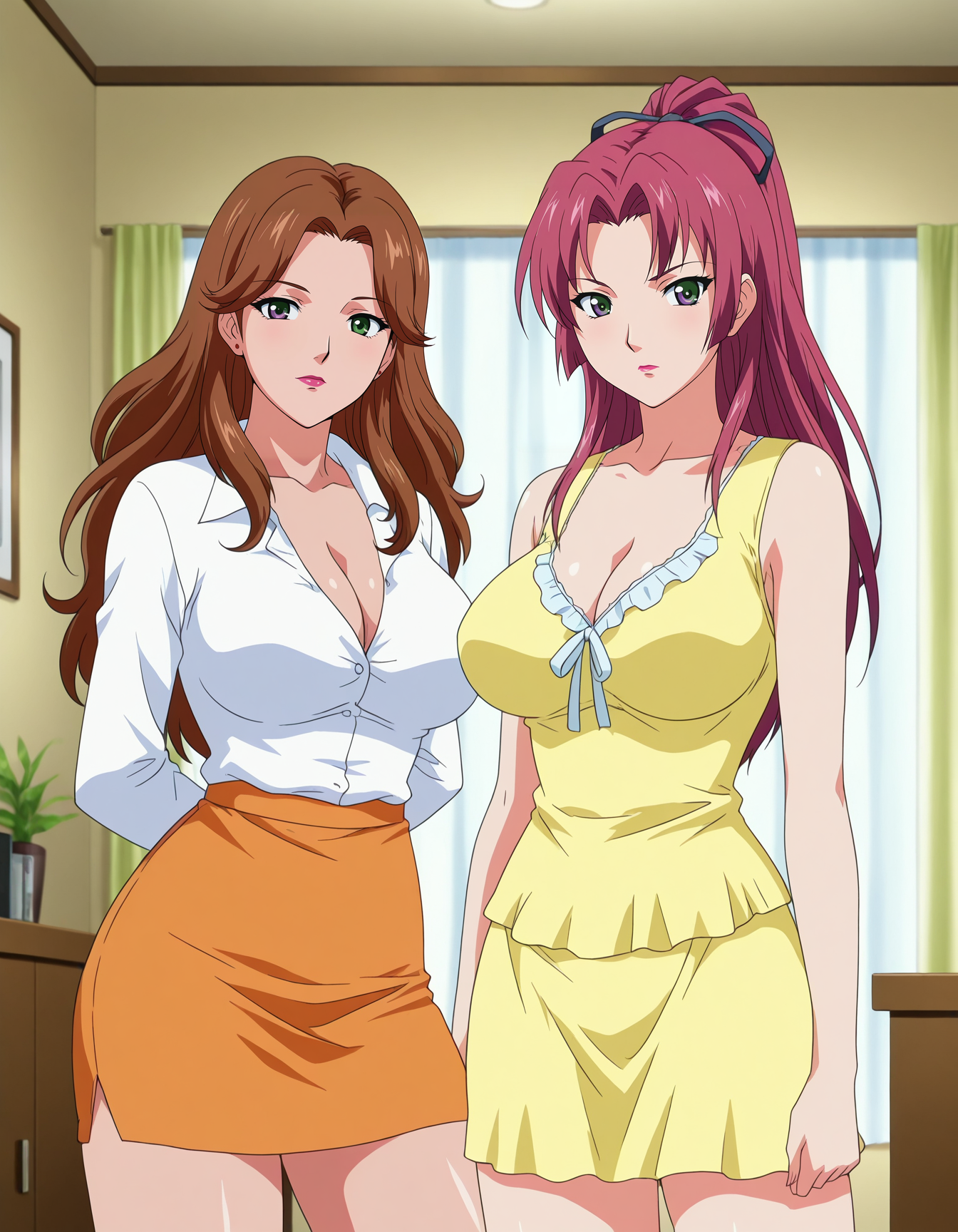 mai_yim,mikiyim,mature_female,long_hair,ponytail,red_hair,purple_eyes,large_breasts,hair_ribbon,lipstick,yellow_dress,frilled,pencil_skirt,yellow_dress,slippers