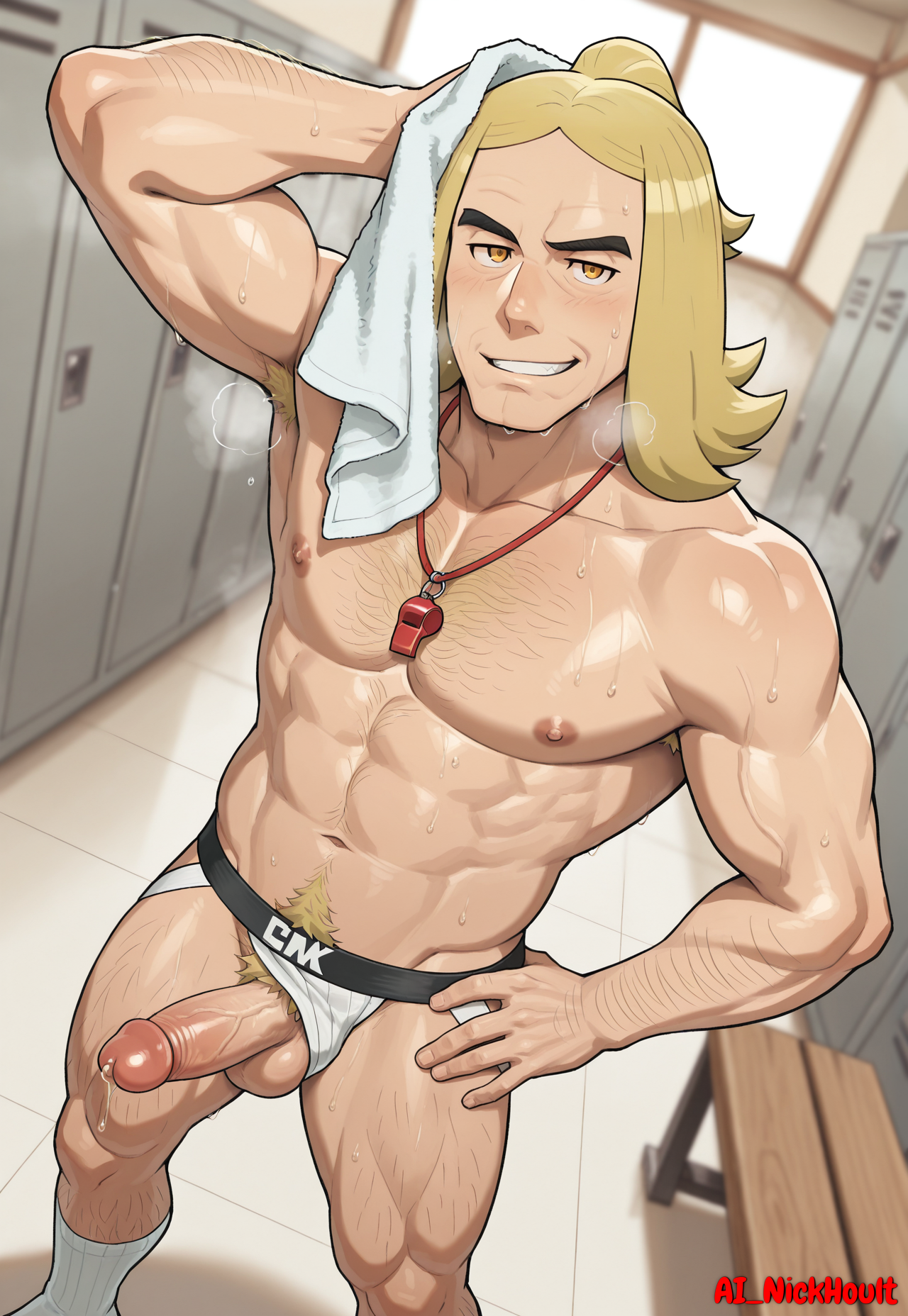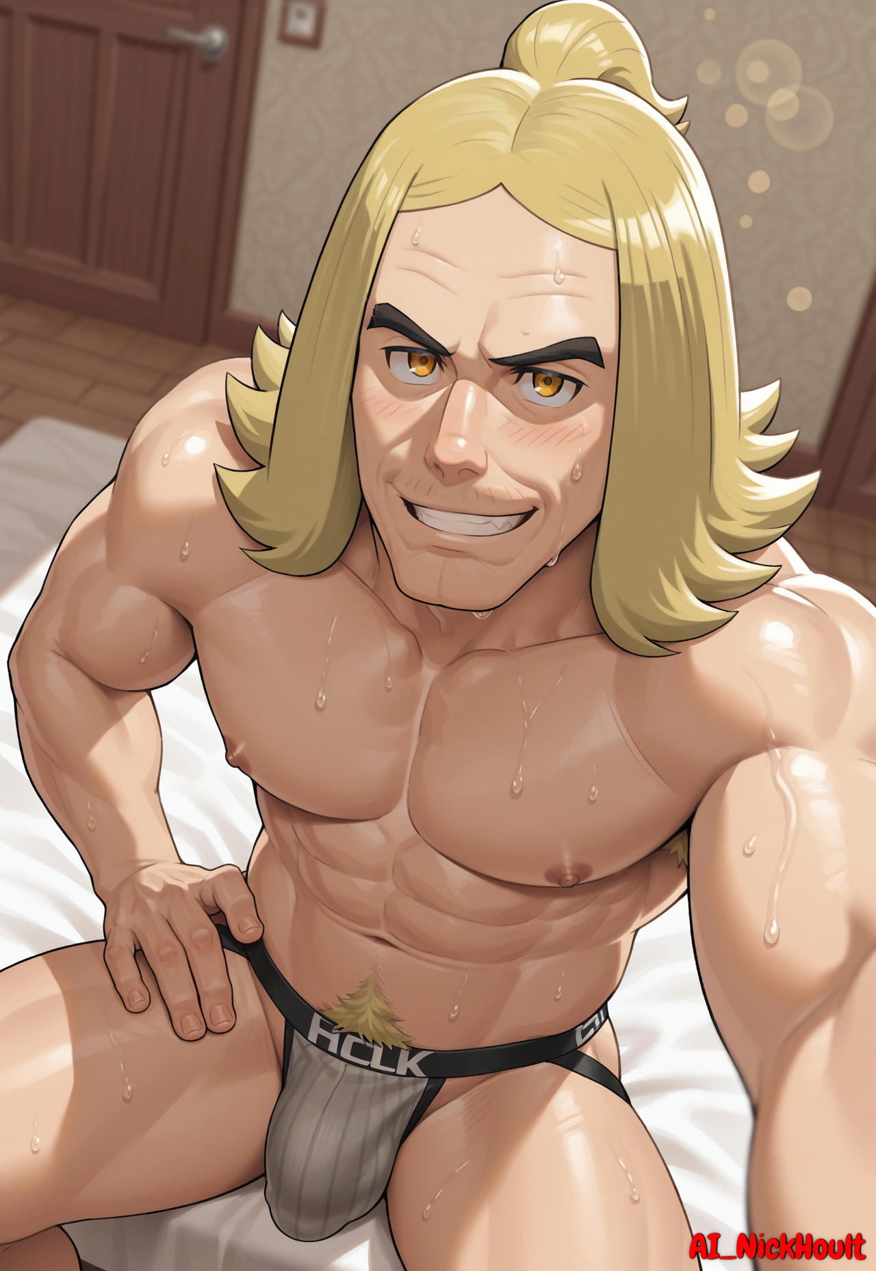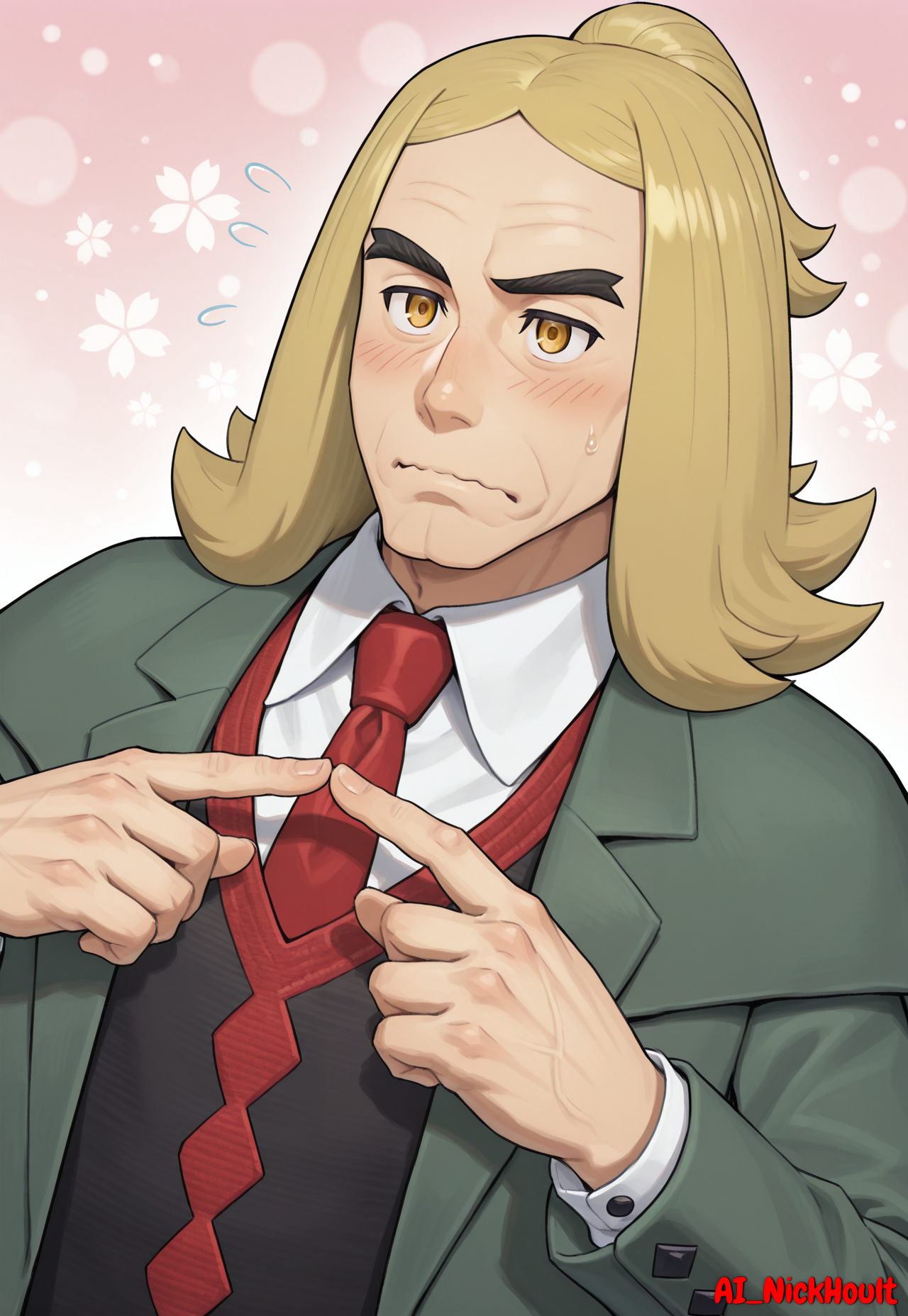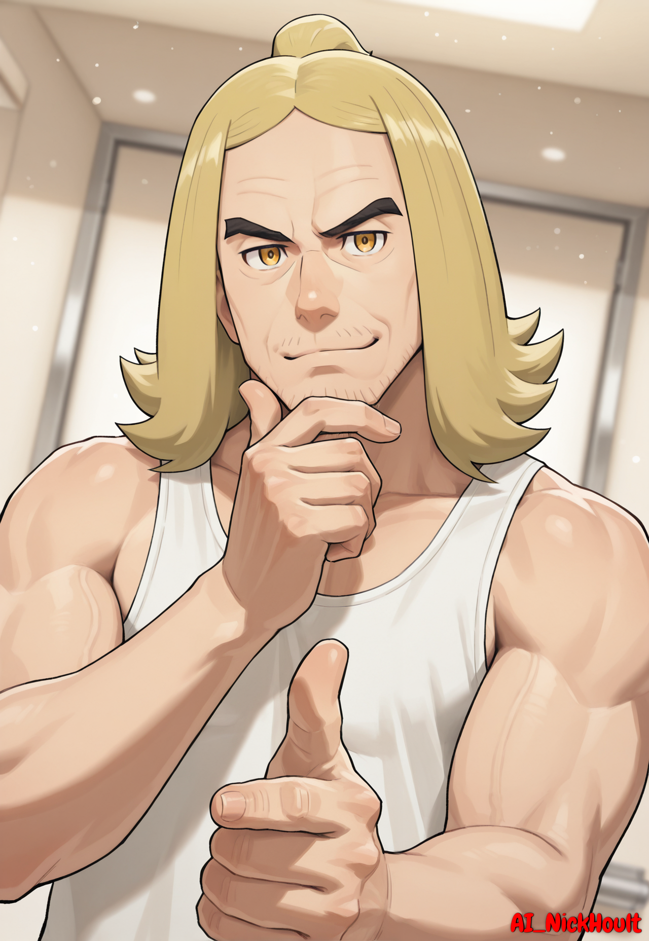 Hassel, mature man, blond hair, long bangs, yellow eyes, light skin, black eyebrows,