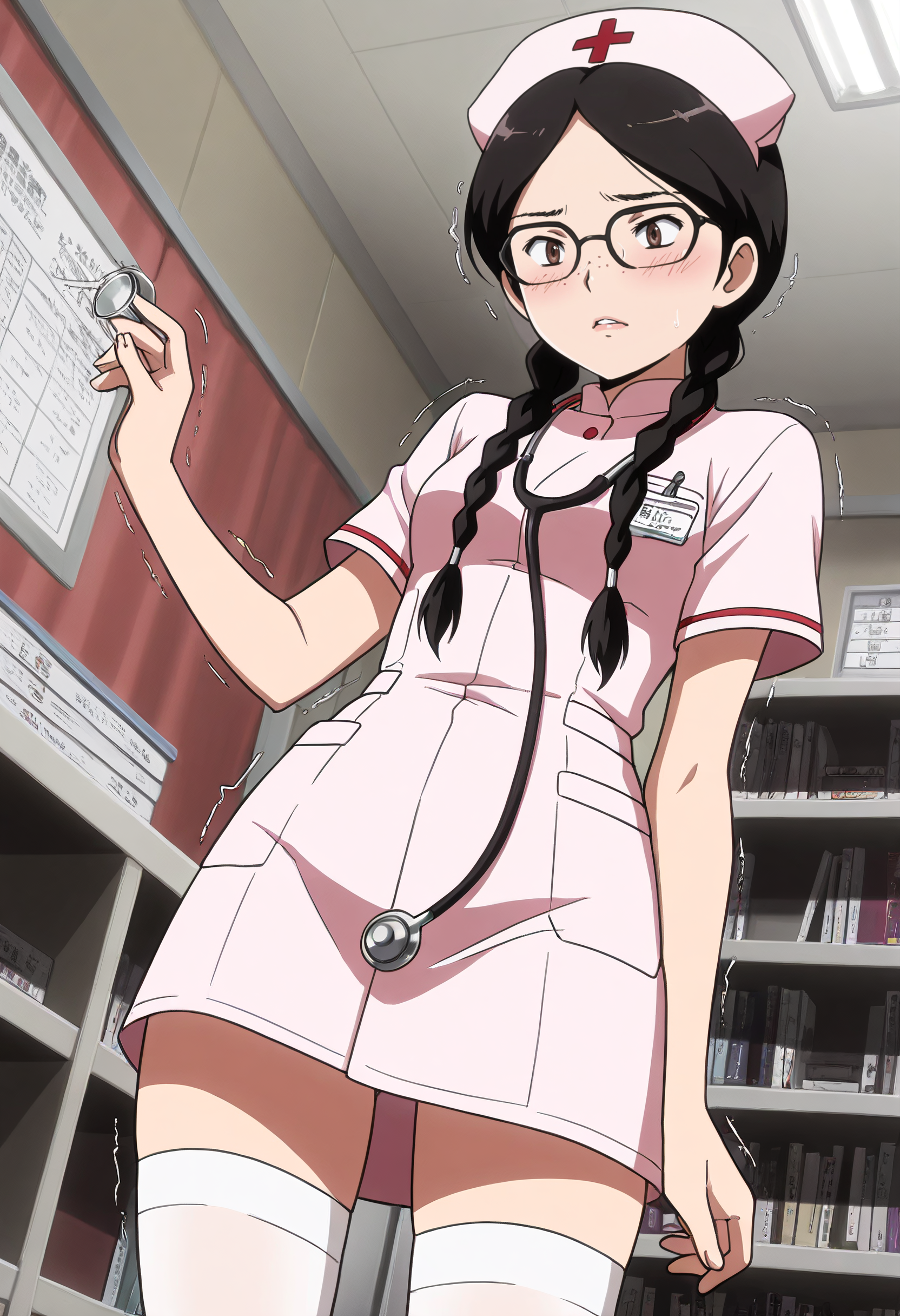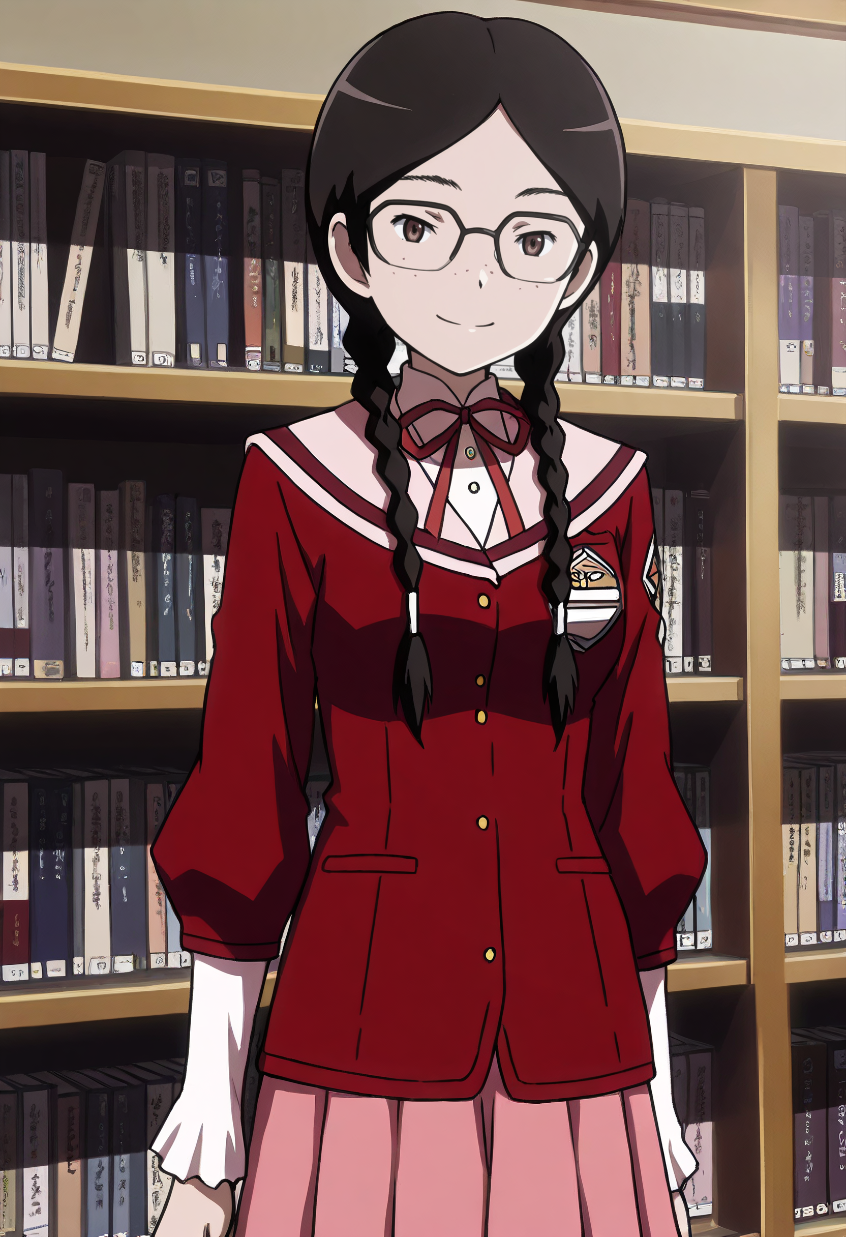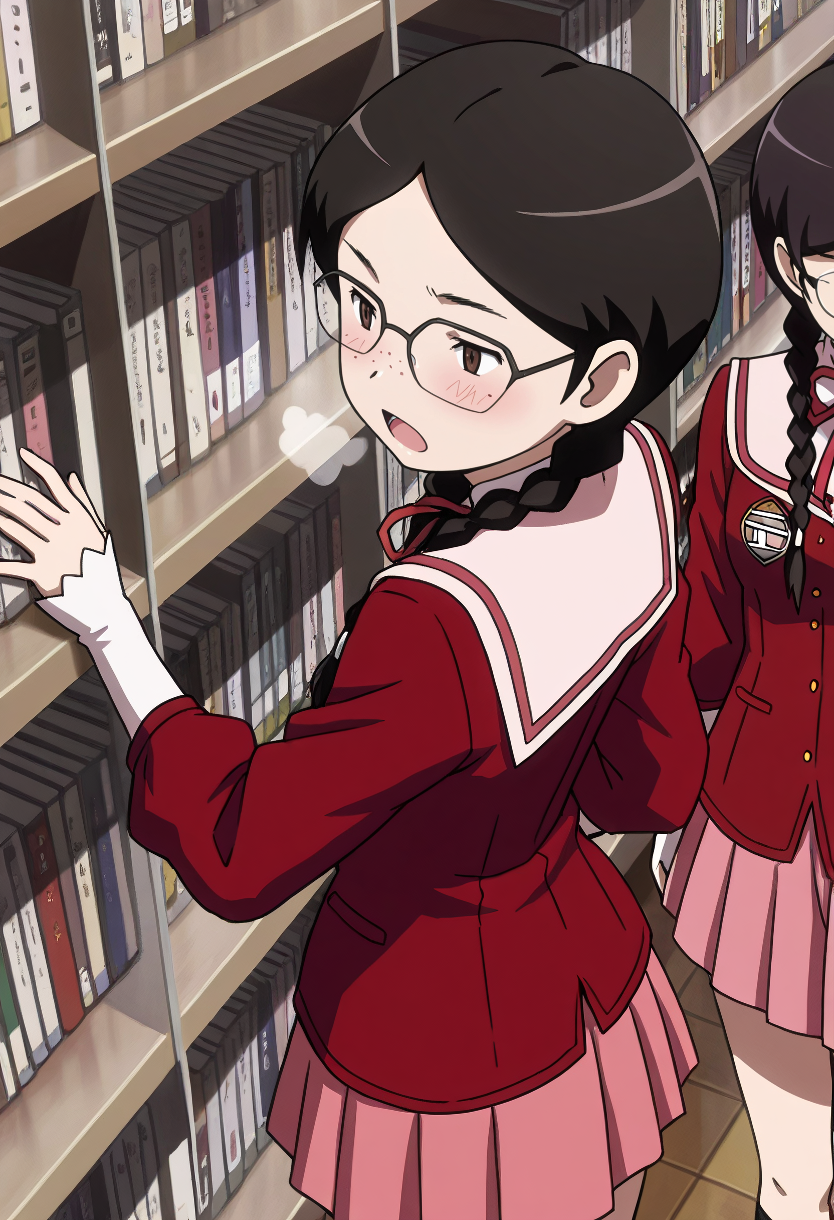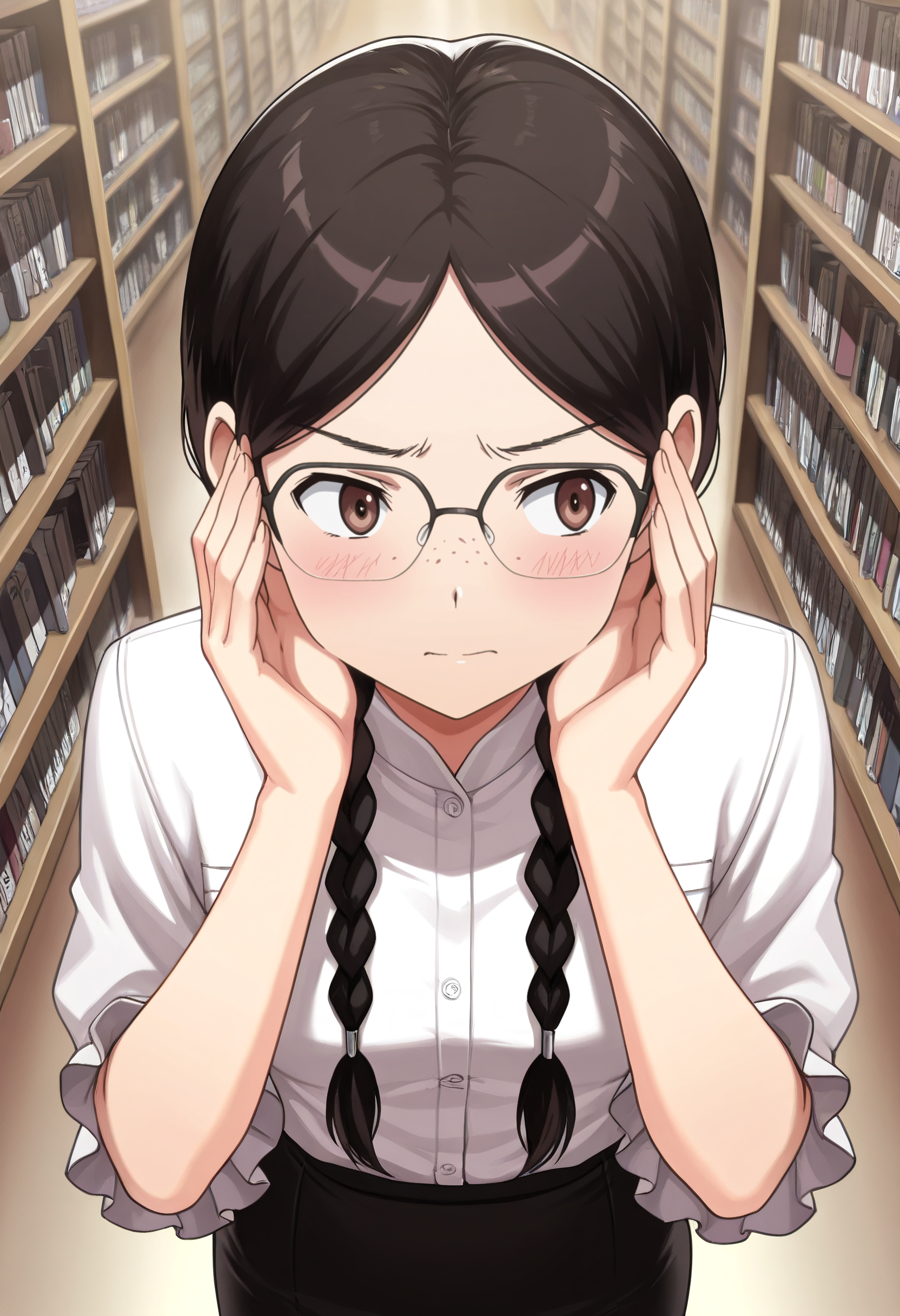 KNZFujiidera、黒髪、編み込み、ツインテール、長い髪、肩にかかる髪、茶色の目、本棚、前髪分け、ツインテール、そばかす、眼鏡、黒縁眼鏡、オーバーリム眼鏡、