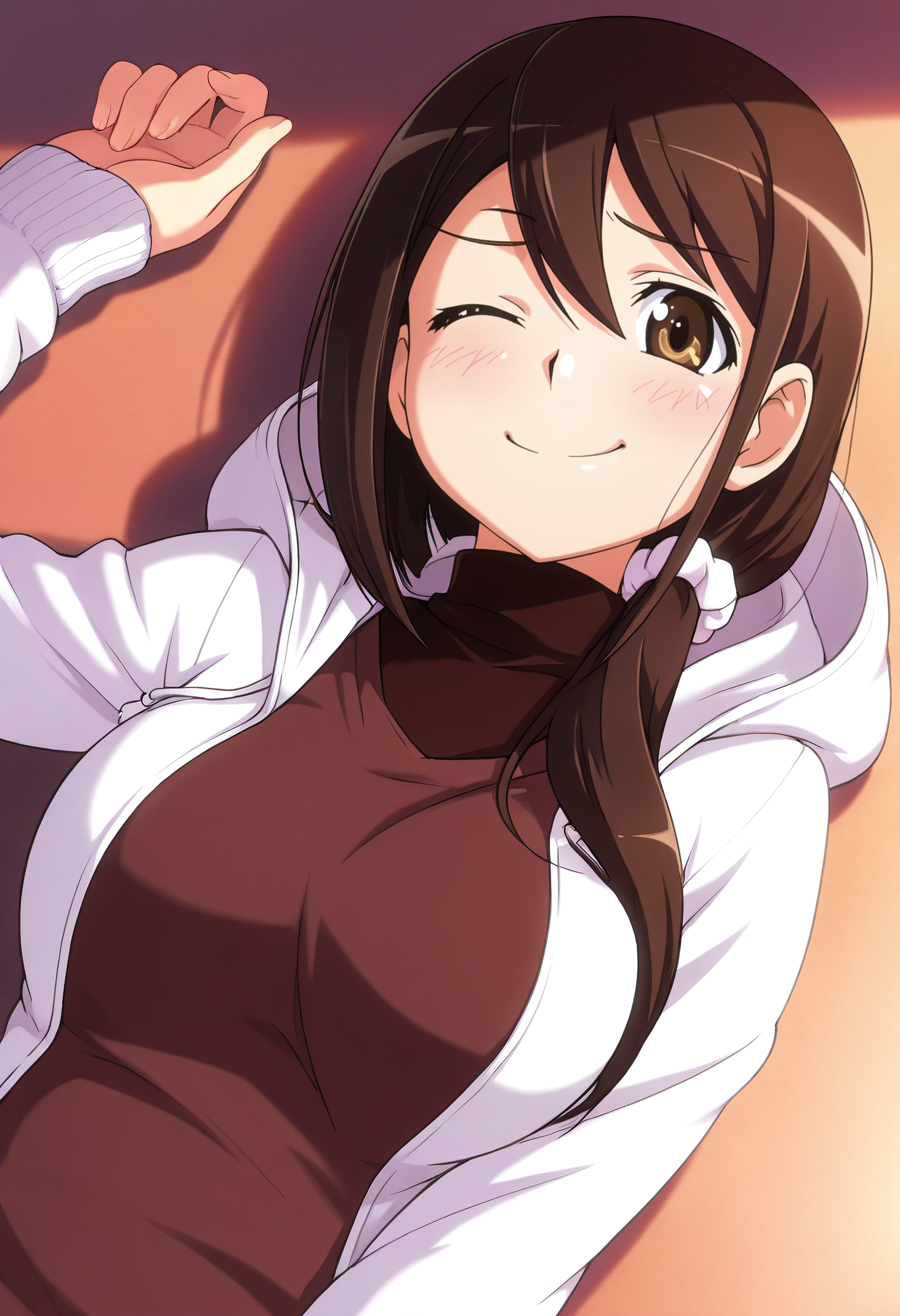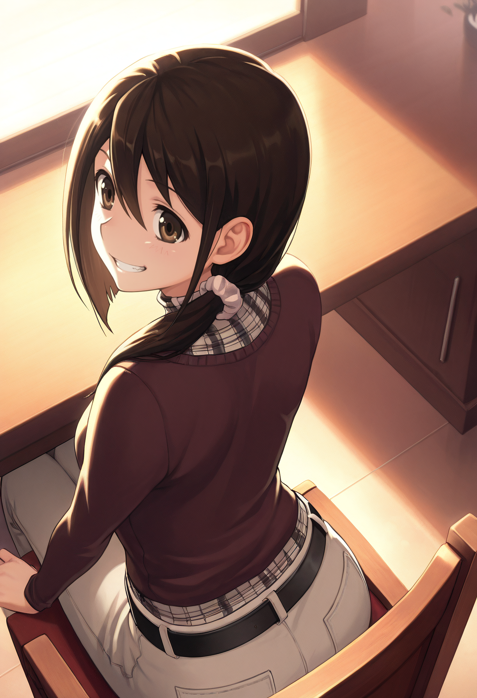 KNZJun, brown hair, brown eyes, long hair, hair over shoulder, ponytail, low ponytail, side ponytail, hair between eyes,