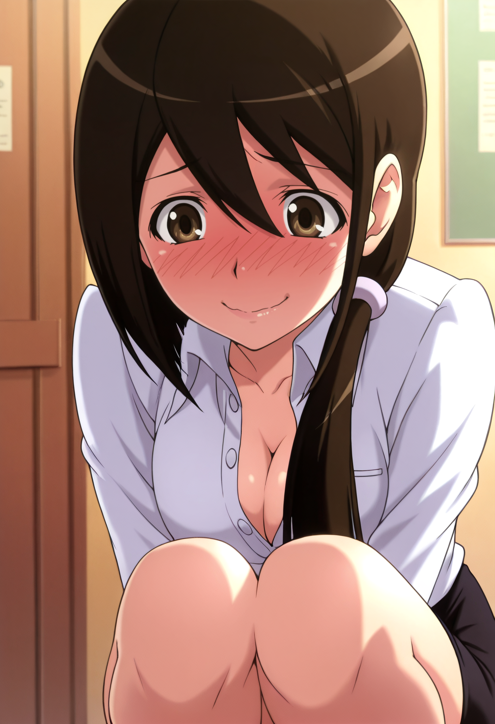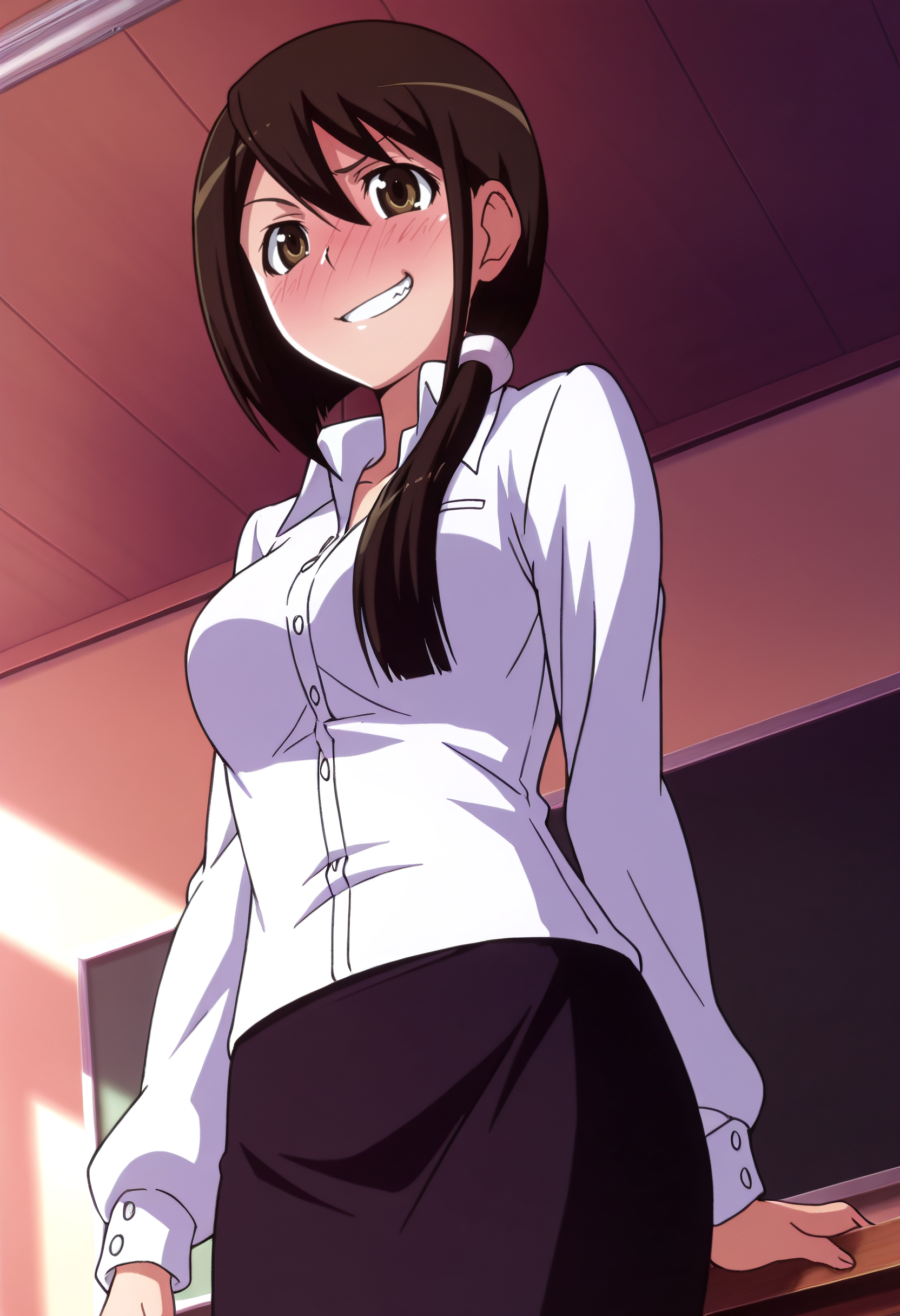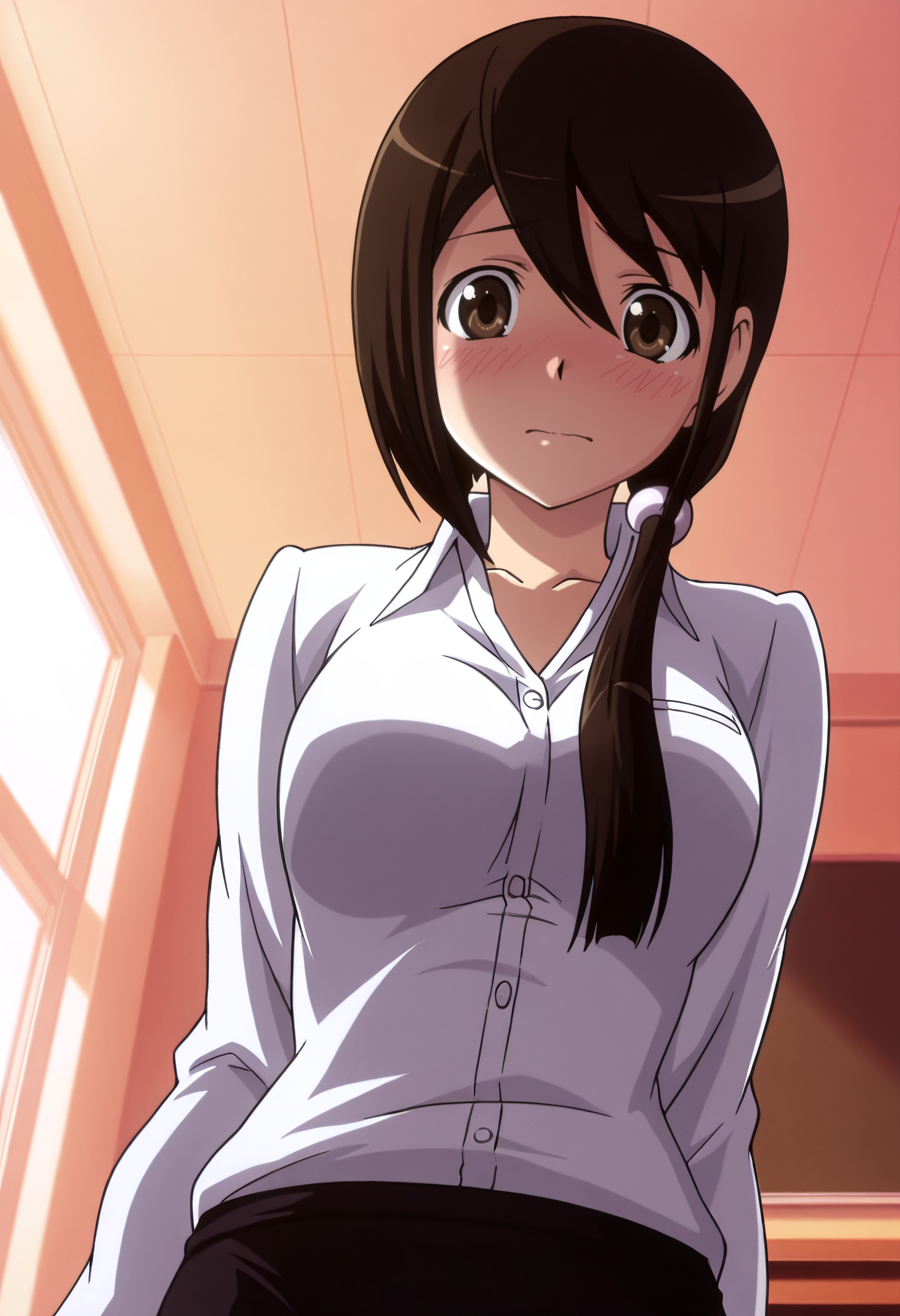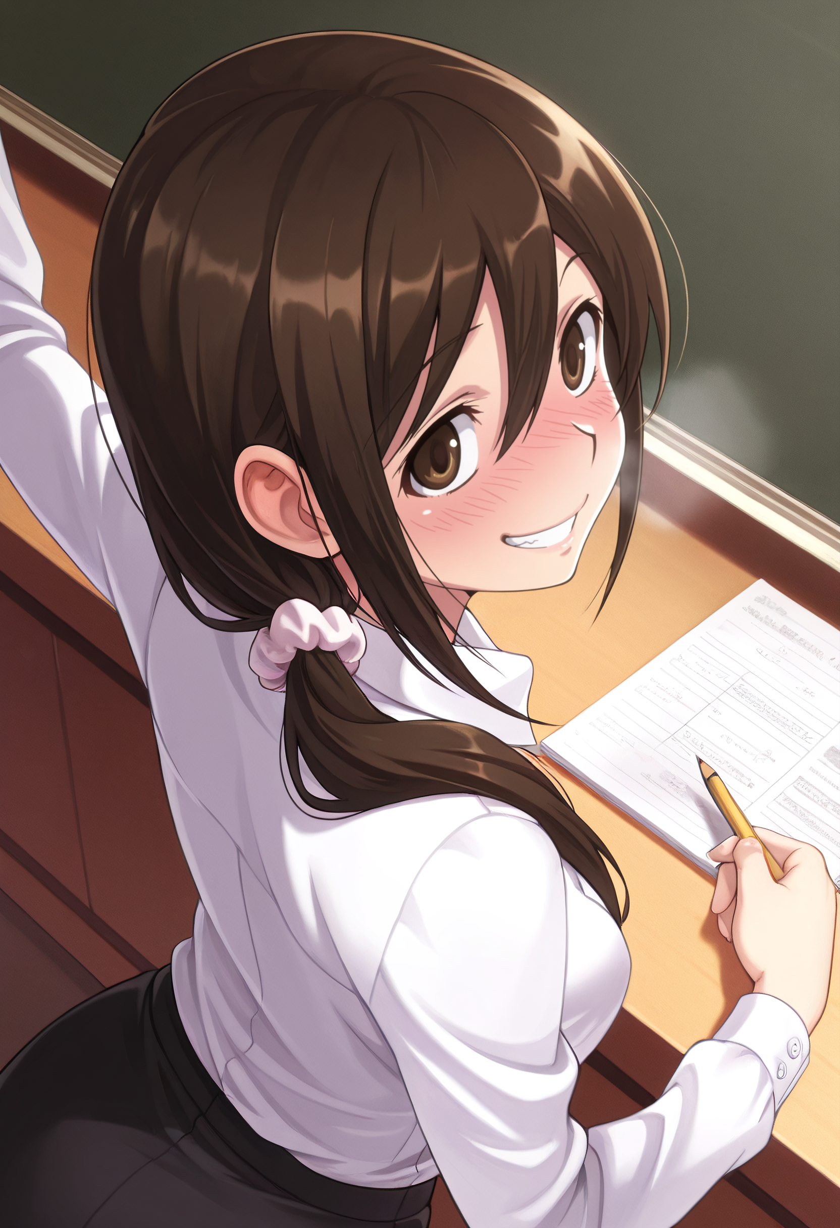 JunSchool, shirt, dress shirt, white shirt, long sleeves, collared shirt, scrunchie, teacher, skirt, pencil skirt, hair ornament, black skirt, open shirt, hair scrunchie,