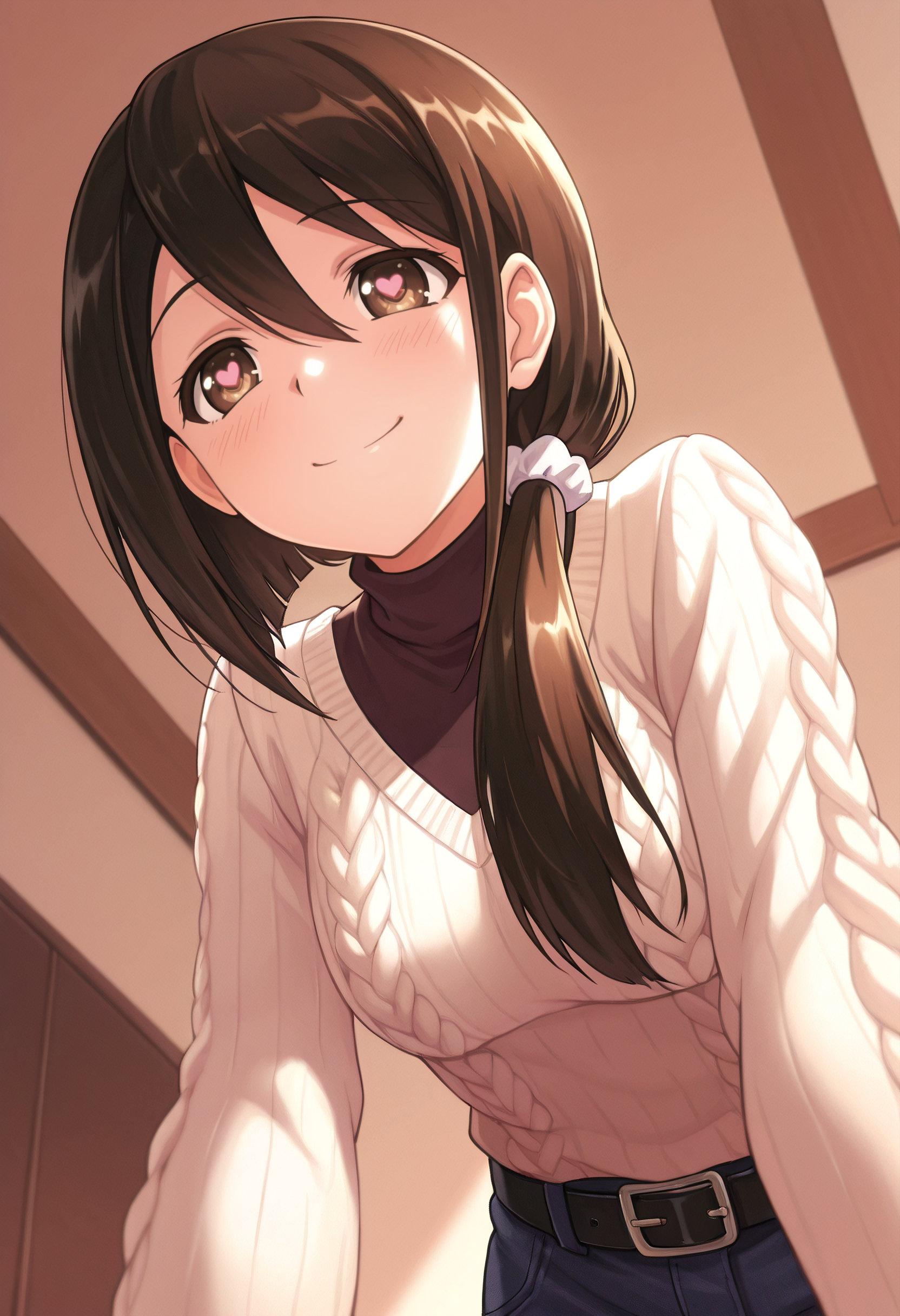 JunSweater, turtleneck, long sleeves, sweater, casual, belt, shirt, black belt, buckle, hair scrunchie, scrunchie, plaid shirt,