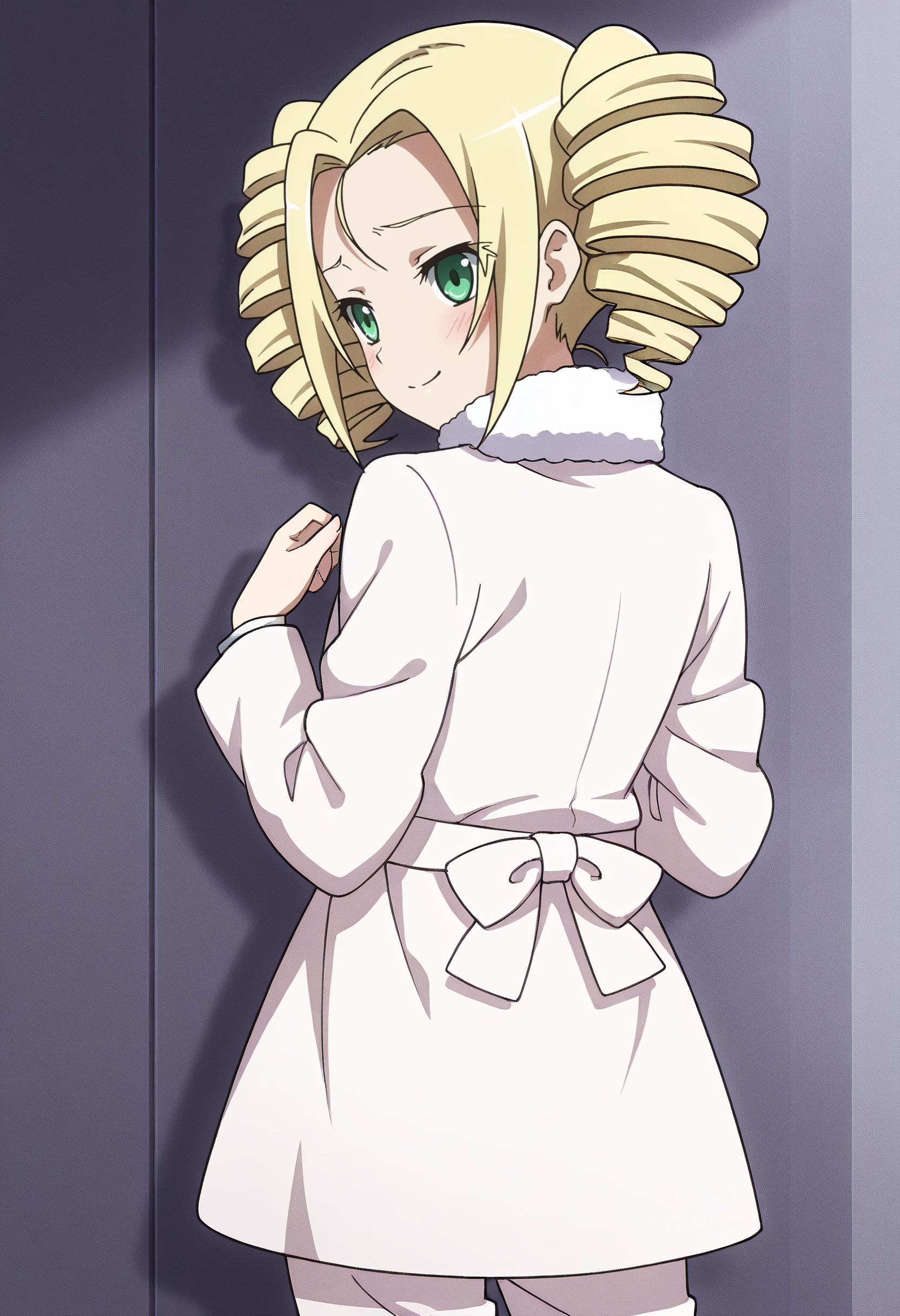 LimeStandard、コート、冬服、ファー縁取り、冬用コート、白いコート、ファー襟、ファー縁取りコート、ファーコート、コートドレス、ロングスリーブ、ダブルブレスト、ボタン、白いリボン、