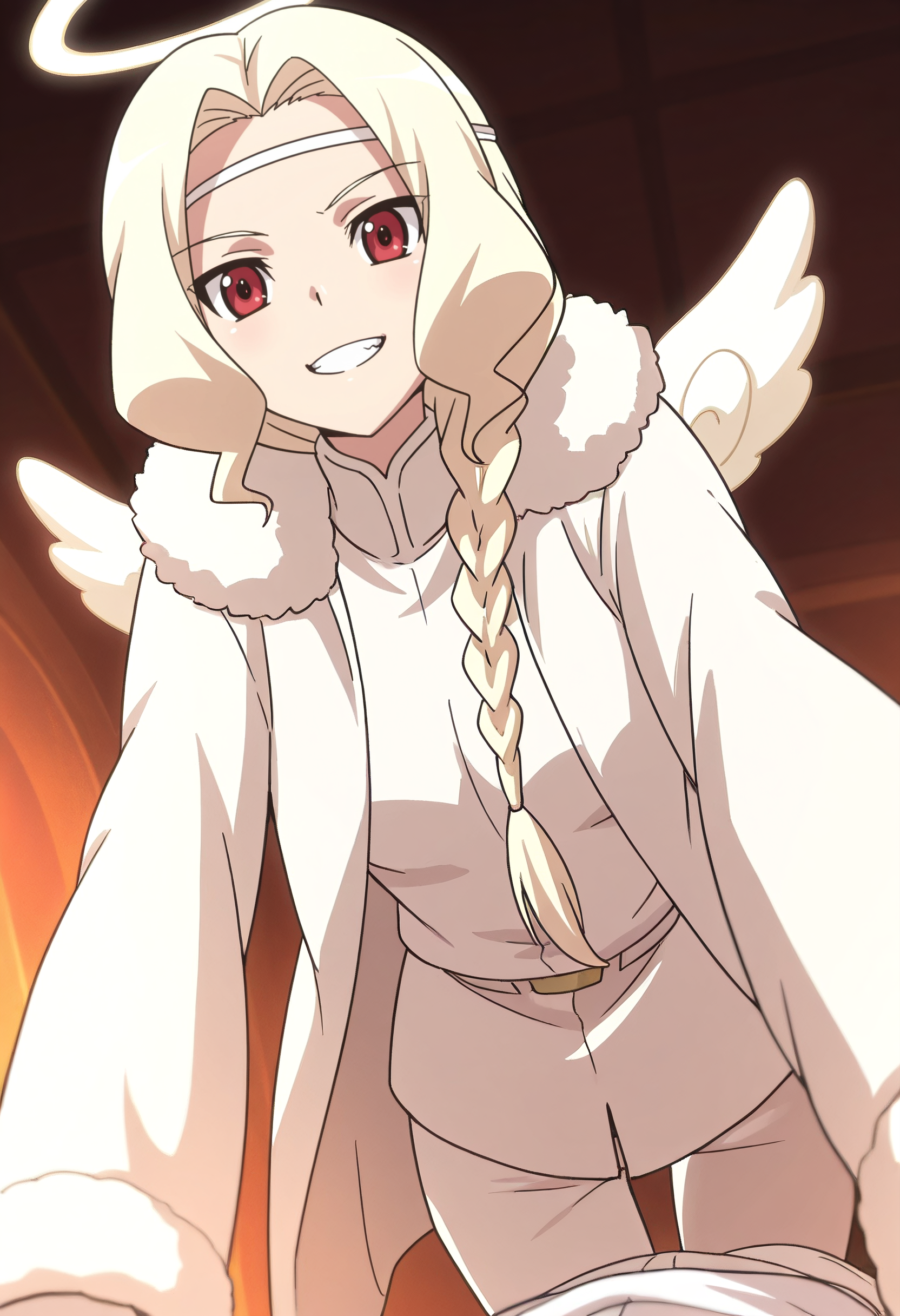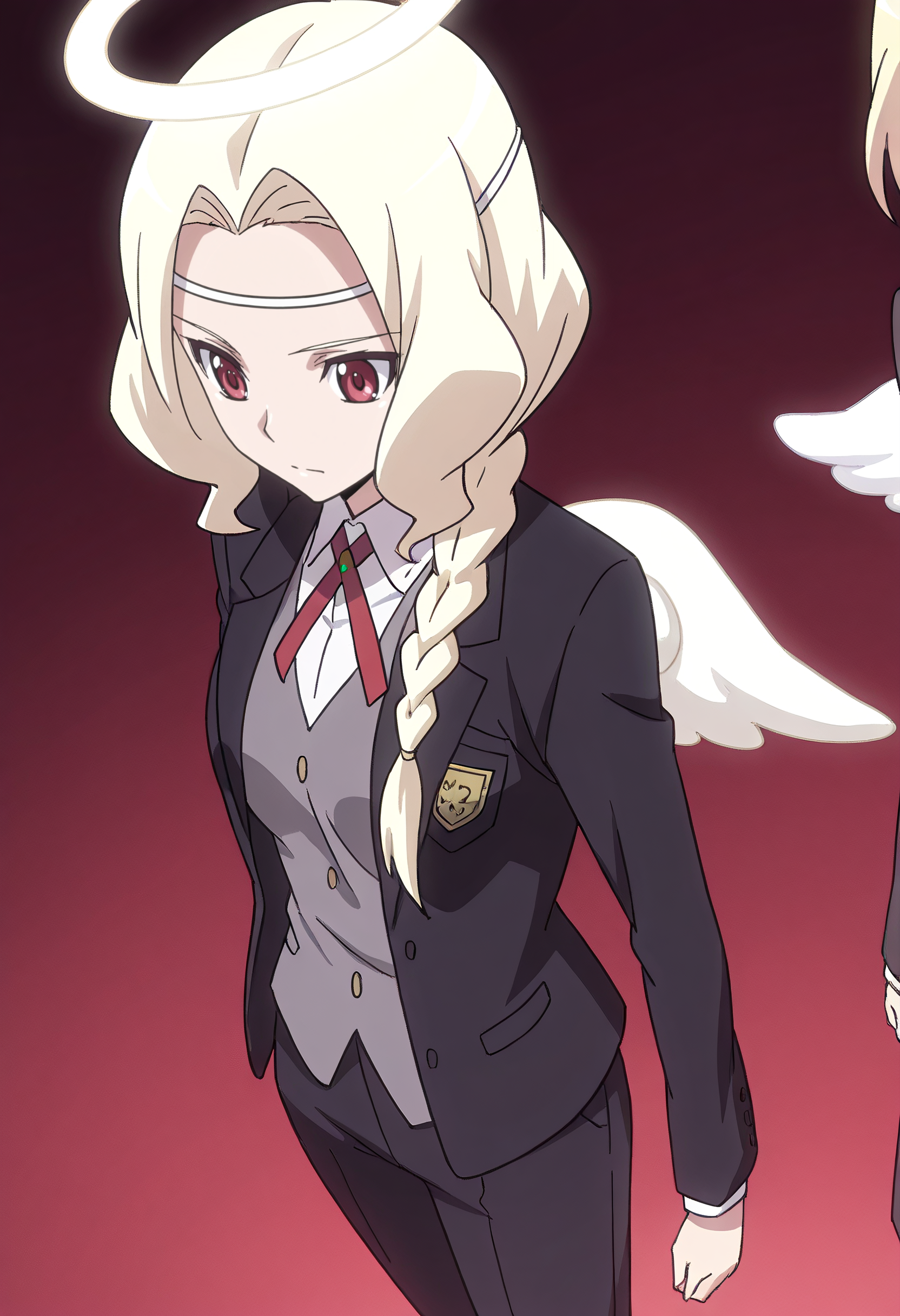 KNZMars、長い髪、赤い目、金髪、編み込み、肩にかかる髪、単一の編み込み、編み込みポニーテール、ヘアバンド、低めのポニーテール、天使、ハロー、伝統的なハロー、白いハロー、