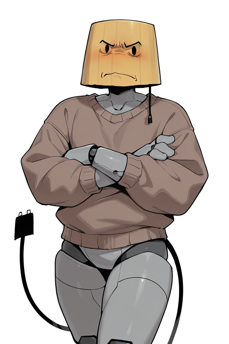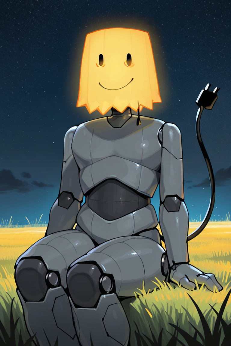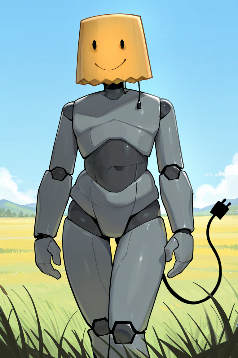 Useful tags: lampert, object head,solid oval eyes, grey body, robot, body robotic joints, cable tail