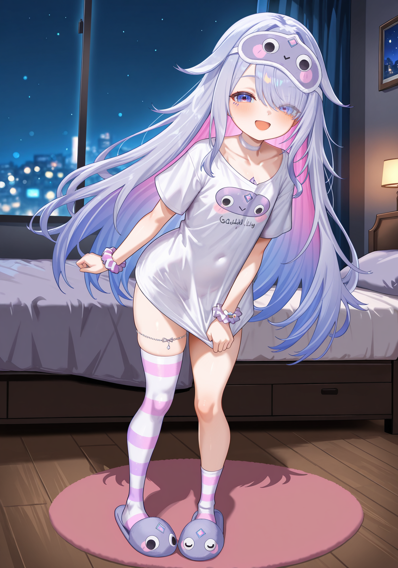 biboopebblepajamas, white shirt, sleepwear, sleep mask, mask on head, wrist scrunchies, asymmetrical legwear, slippers, low twintails,