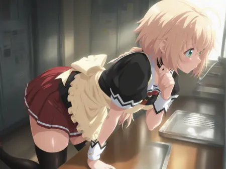 衣装:(学ラン、黄色のエプロン、チョーカー、赤いスカート、手首のカフス、黒い太ももハイズ)