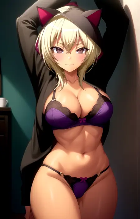 Lingerie: use purple bra, purple panties, string panties, and o-ring panties.