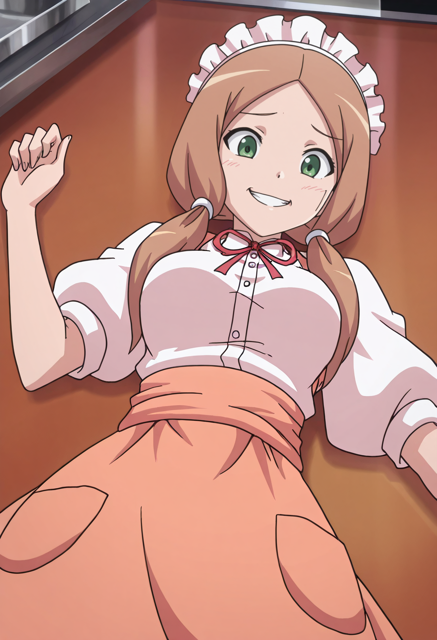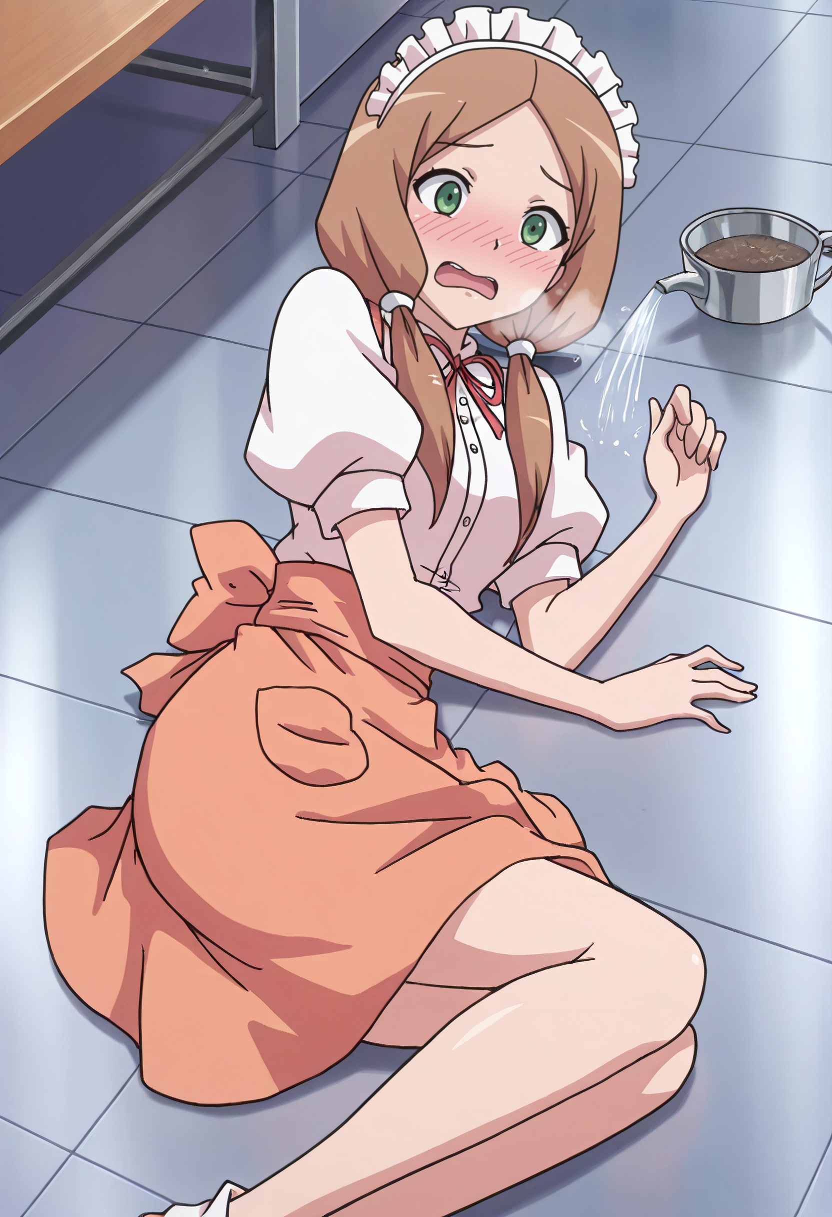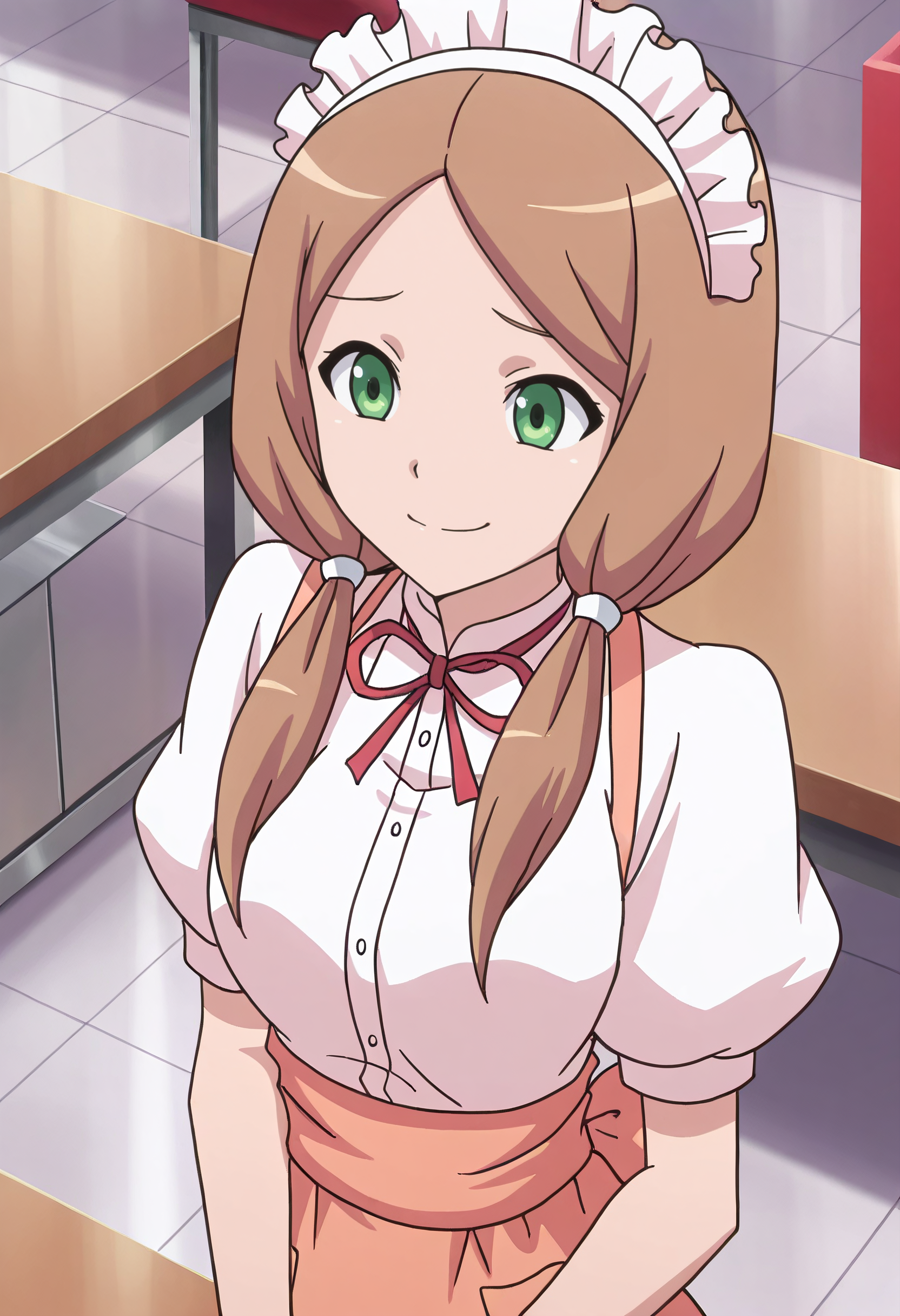 MobukoWaitress、ウェイター、短袖、ふわふわ袖、スカート、ふわふわ短袖、エプロン、シャツ、リボン、白いシャツ、ウエストエプロン、オレンジ色のエプロン、リボン、メイドヘアード、首リボン、メイド、赤いリボン、ヘアード