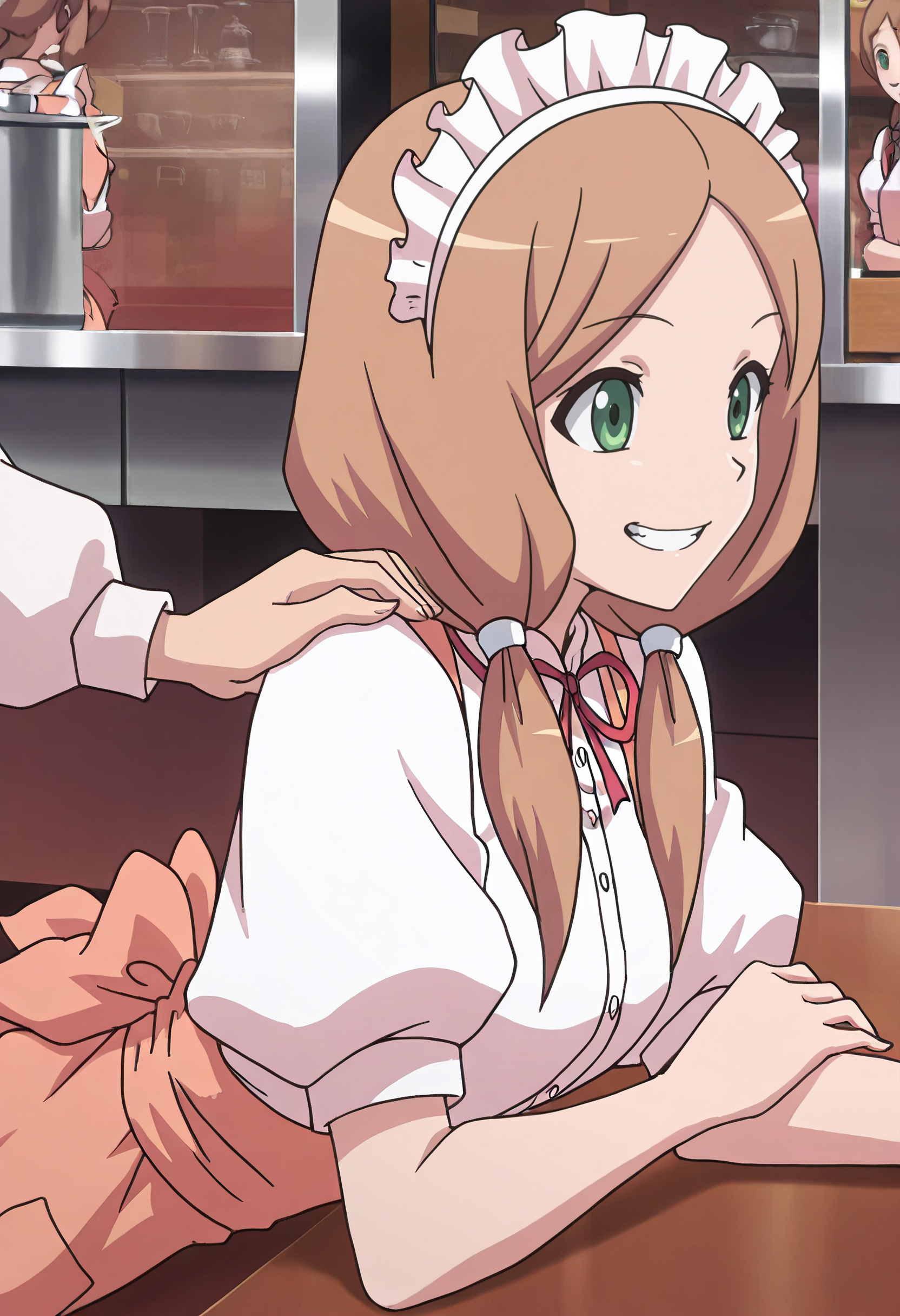 KNZMobuko、低めのツインテール、茶色の髪、ツインテール、長い髪、緑の目、肩にかかる髪