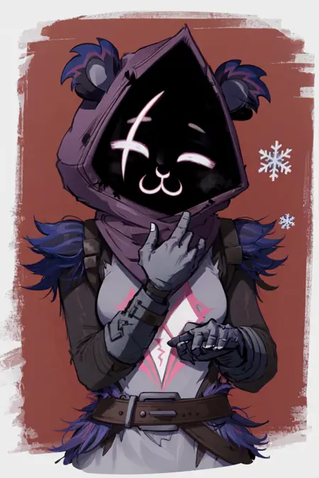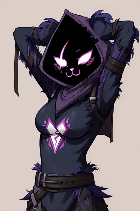 提示词:Raven Team Leader, 1girl, 紫色兜帽, 动物耳朵, 阴影面部, 紫色皮肤, 眼部疤痕, (毛茸茸), (身体毛发:1.2), 紫色毛发, 腰带, 背带, :3, 胸部符号