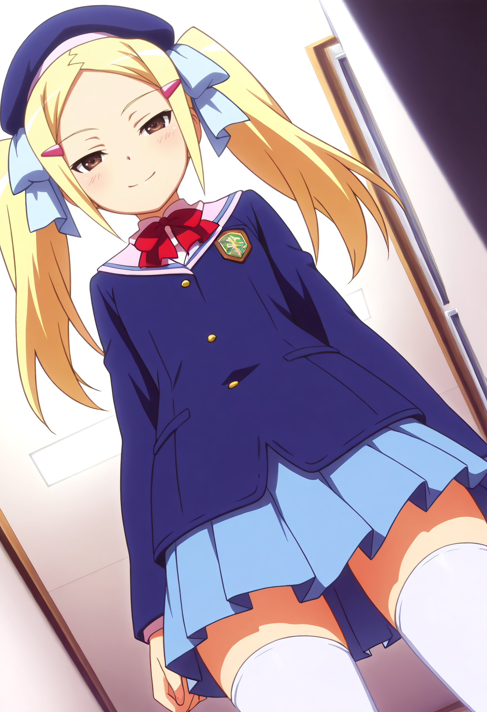 MioShirt、学校制服、ヘアクリップ、髪飾り、リボン、帽子、 bow、太もも長靴、スカート、プリーツスカート、ベレー帽、ジャケット、ブレザー、ボウタイ、ヘアリボン、青いスカート、セーラー服、赤い bow、赤いボウタイ、白い太もも長靴、