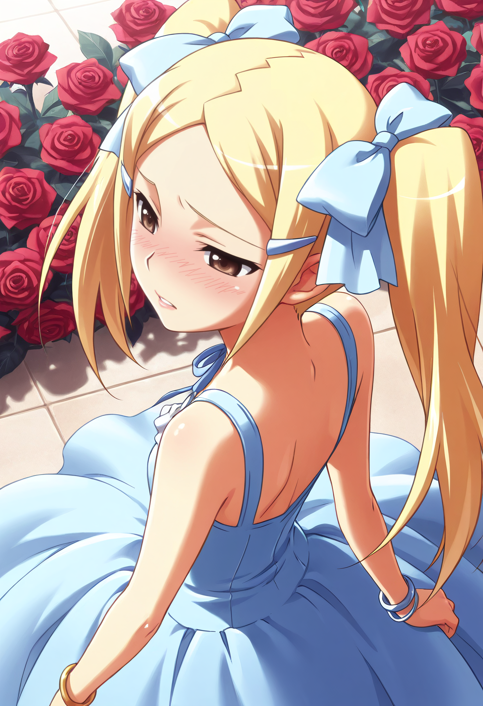 MioDress、リボン、ヘアリボン、ヘアクリップ、髪飾り、ドレス、ブレスレット、ジュエリー、肩出し、青いドレス、花、バラ、ロングドレス、 bow、ガウン、ノースリーブドレス、髪のリボン、