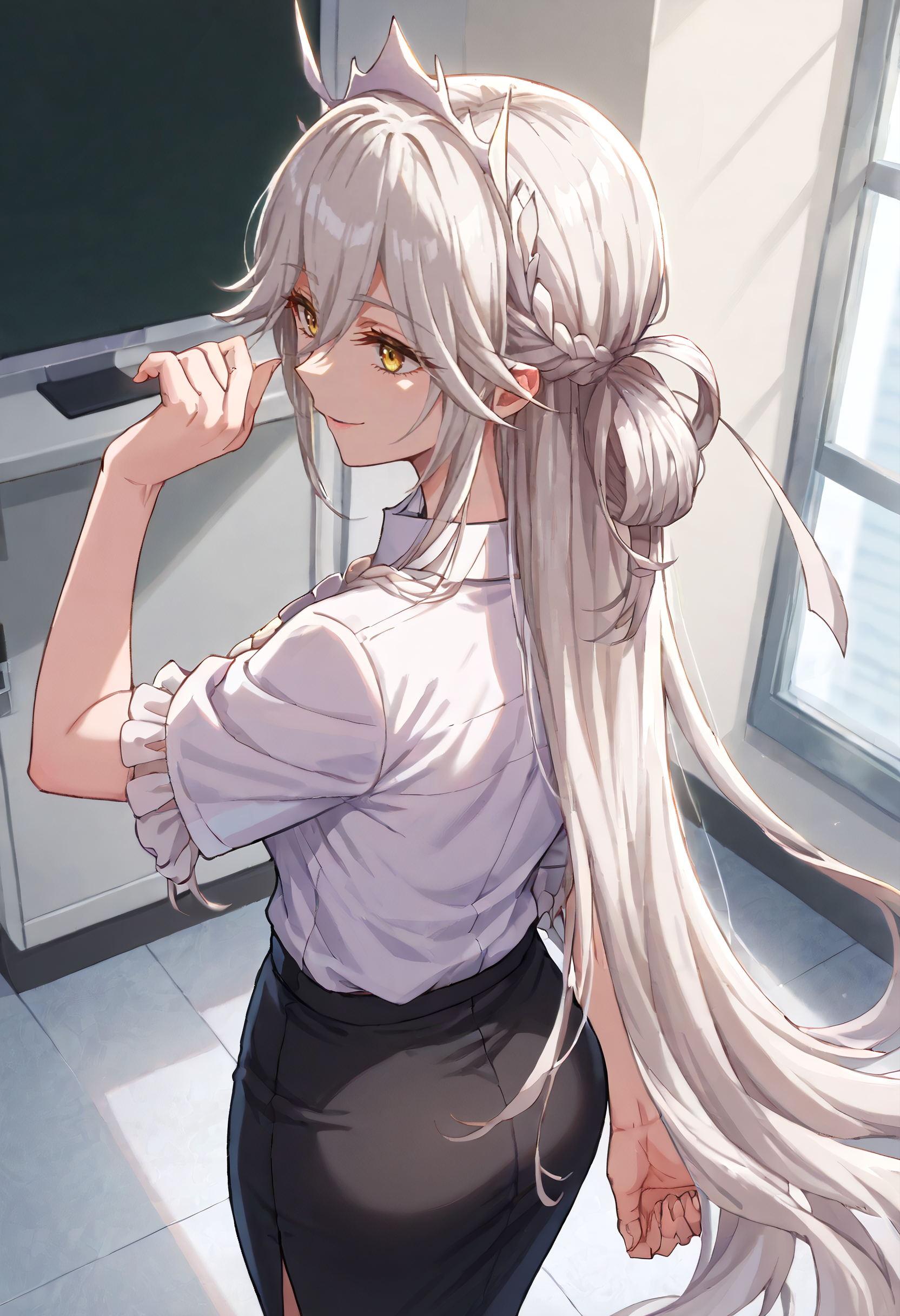 FFrVicius、長い髪、目の中の髪、前髪、髪を通して見える眉、黄色い目、非常に長い髪、銀髪、編み込み、