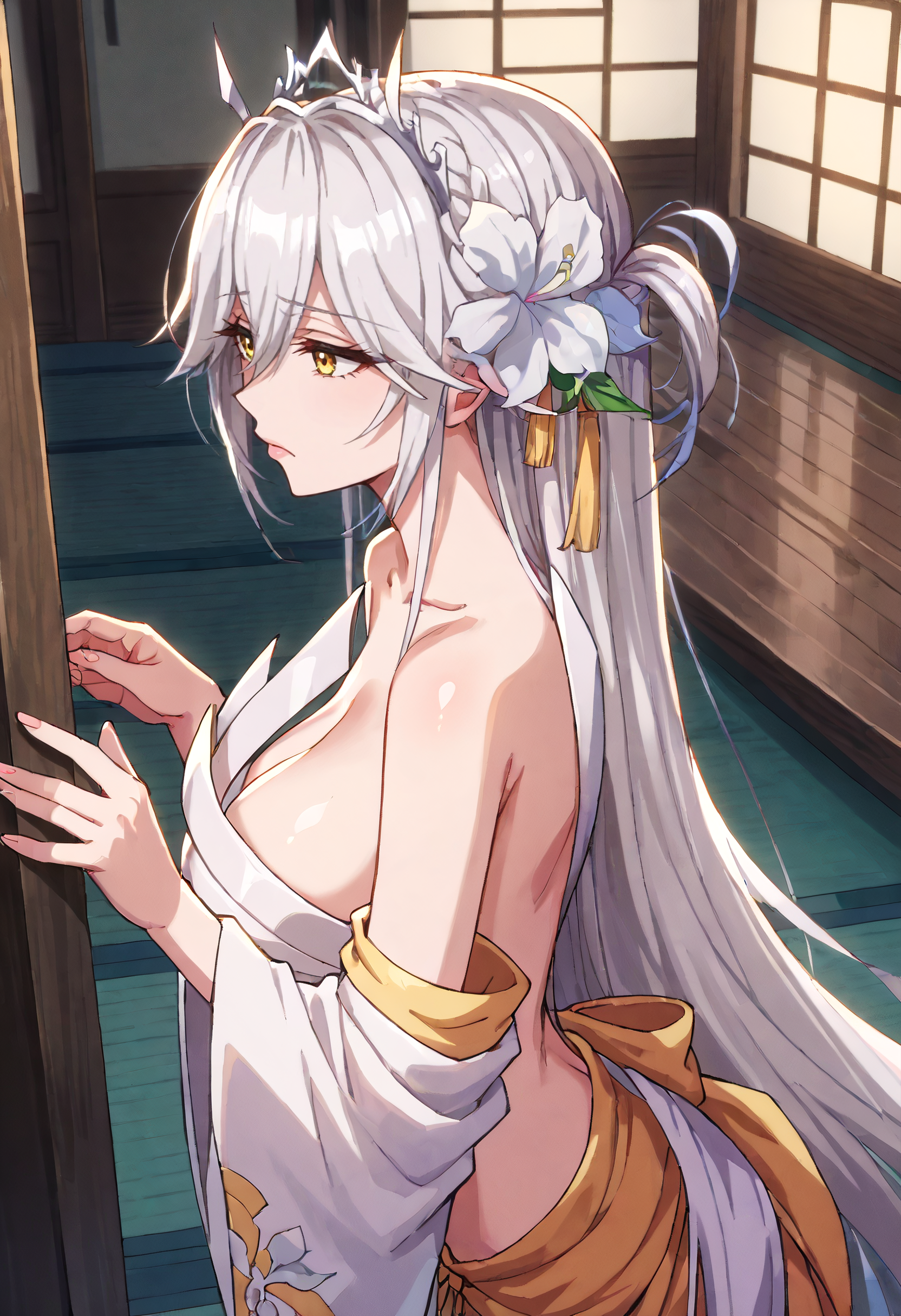 ViciusOutfit、肩出し、髪飾り、花、髪の花、ドレス、日本の服、リボン、肩出し、へそ、ヌード、広い袖、白いドレス、長袖、笹巻き、取り外し可能な袖、ティアラ、髪のフラップ、白い花、腹部、