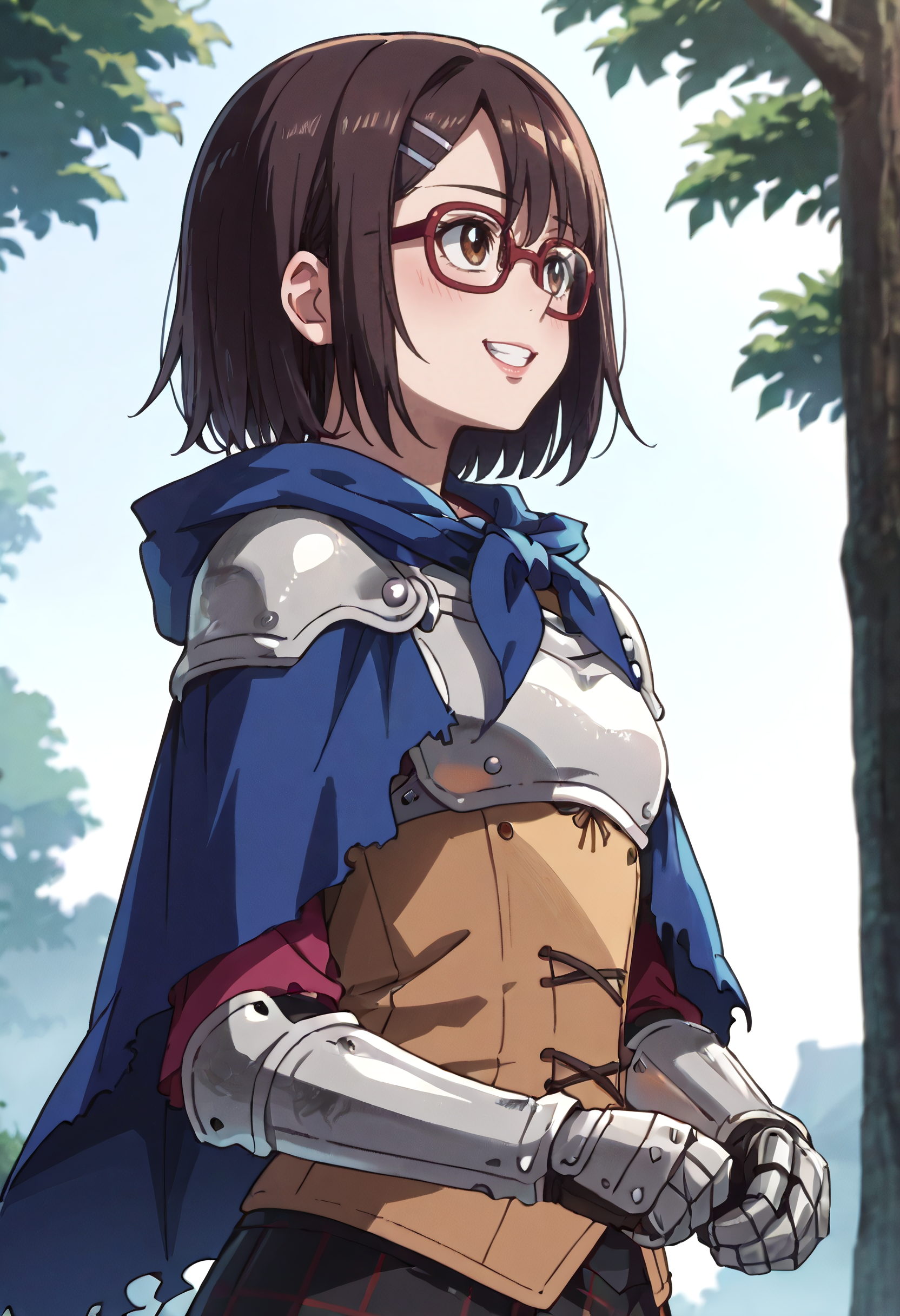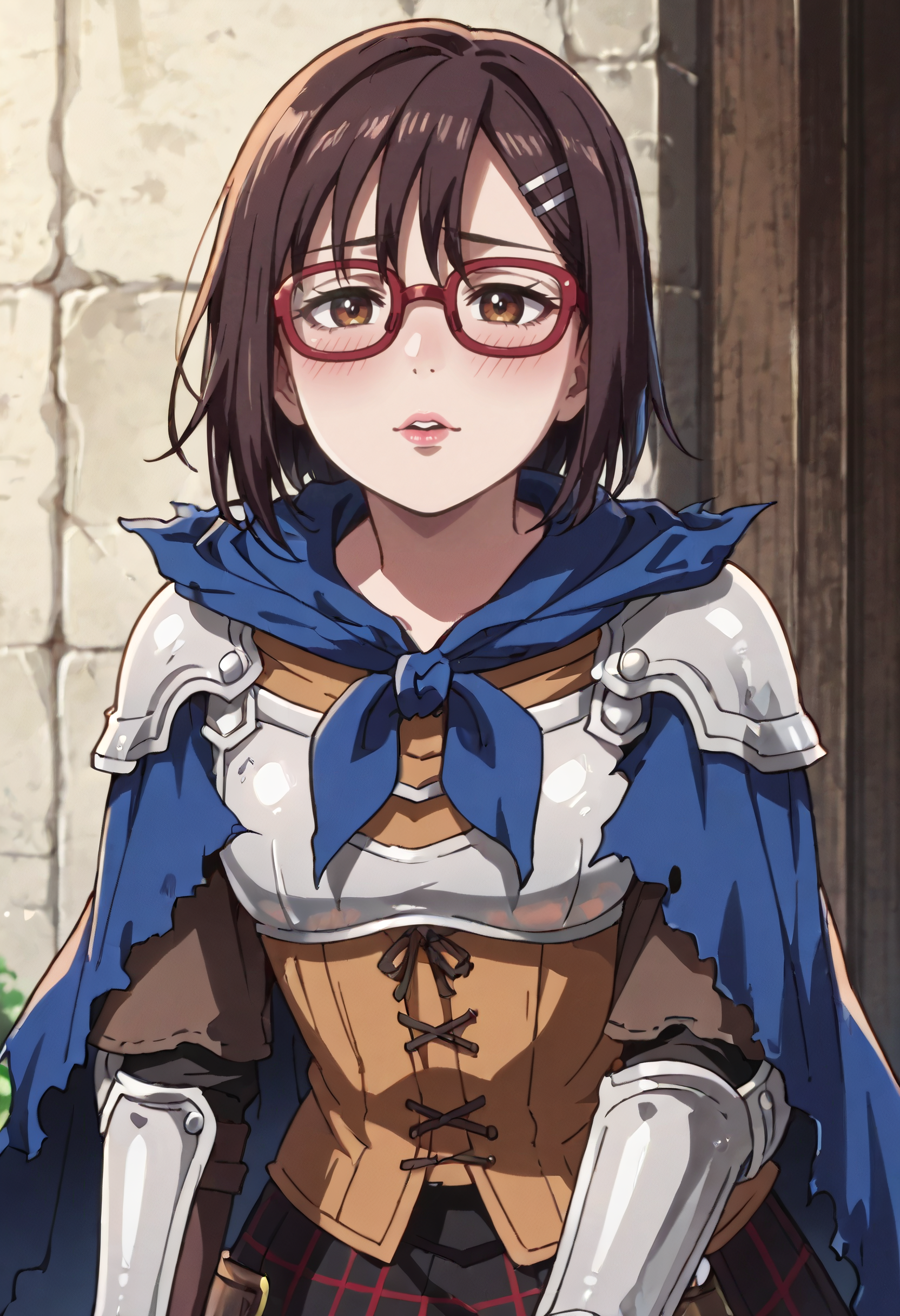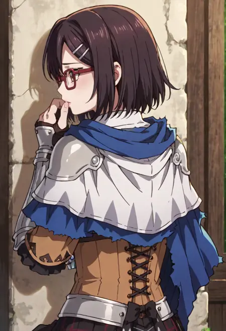 SuouCombat、髪飾り、髪留め、スカート、マント、シャツ、黒スカート、チェック柄、チェック柄スカート、鎧、手甲、胸当て、ショートマント、青いマント、ネッカチーフ、肩甲部の装甲、