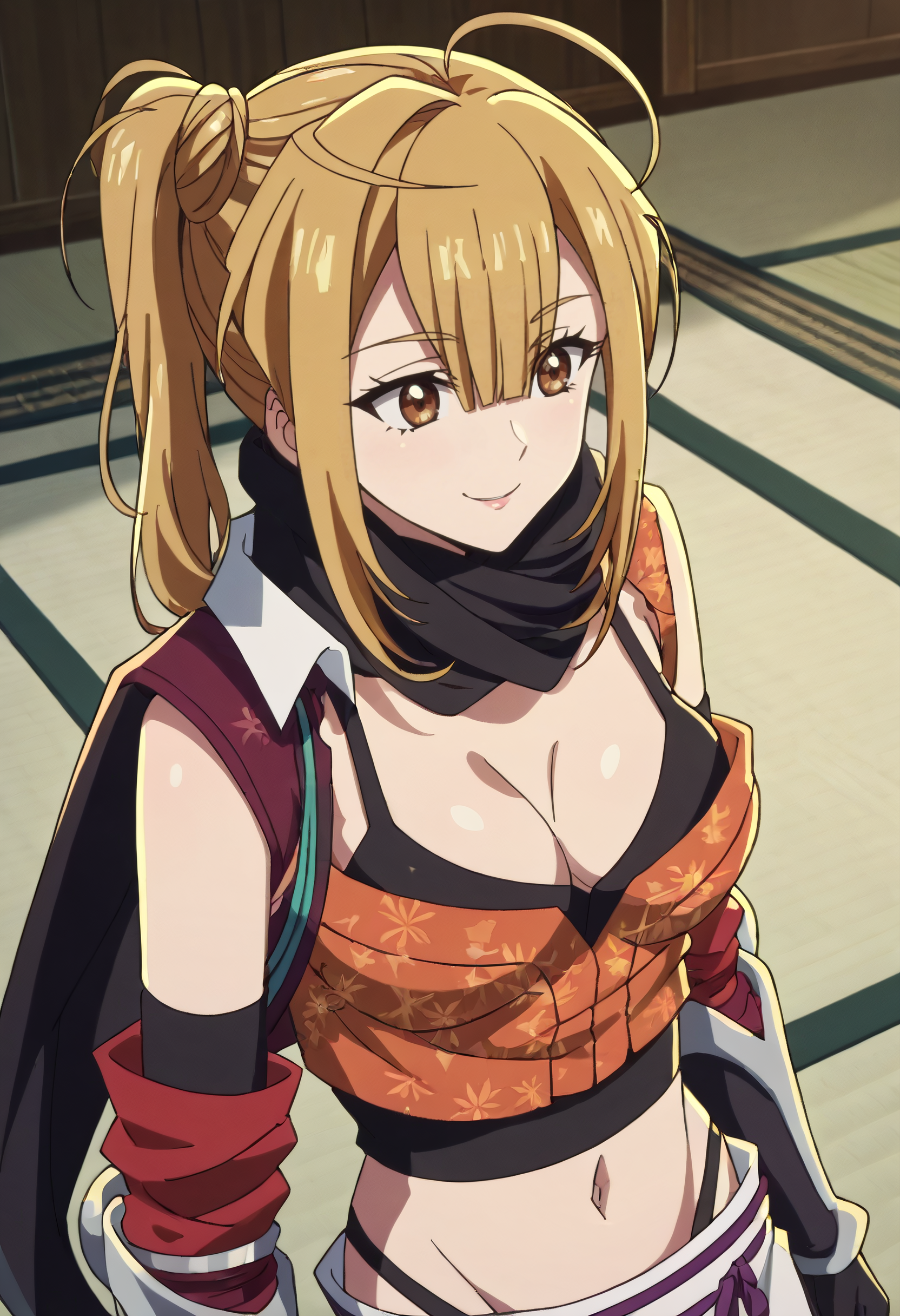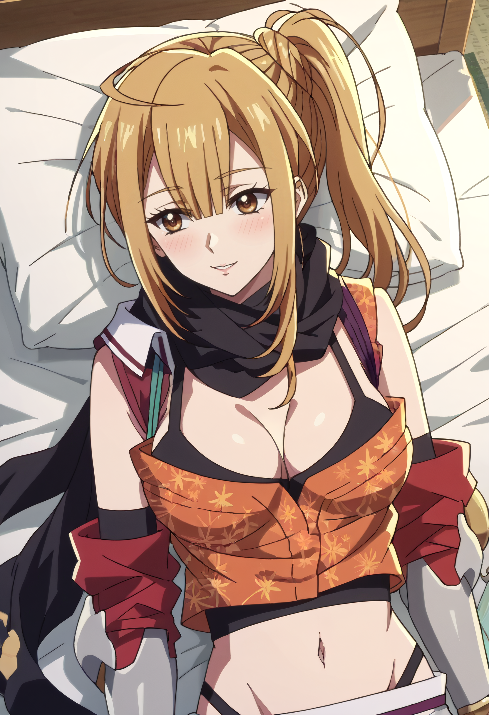 ItsukiCroptop, 스카프, 가슴 노출, 장갑, 배꼽, 검은 스카프, 허벅지 길이 양말, 허리, 재킷, 어깨 드롭, 검은 장갑, 치마, 셔츠, 분리형 소매, 팔꿈치 장갑,
