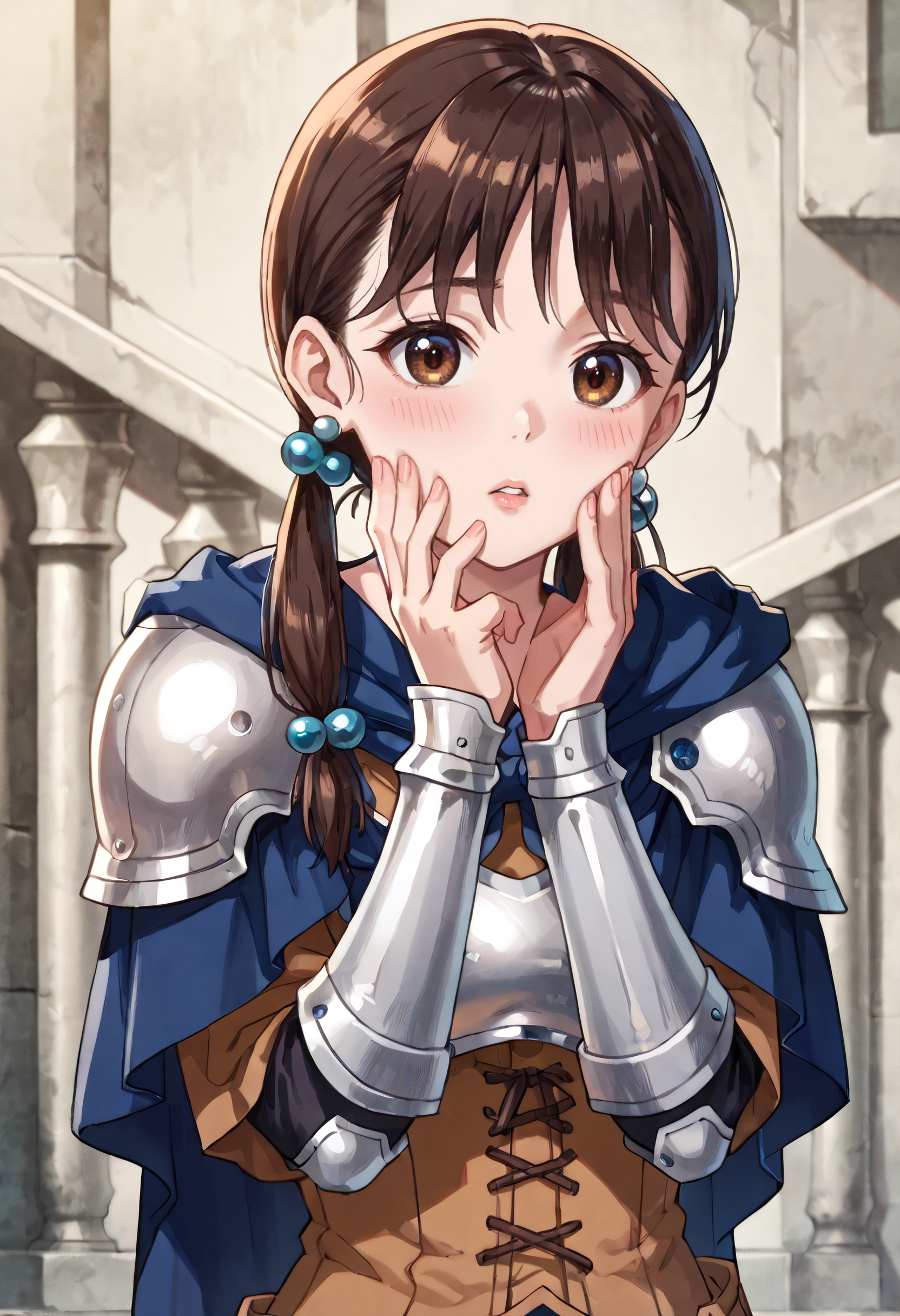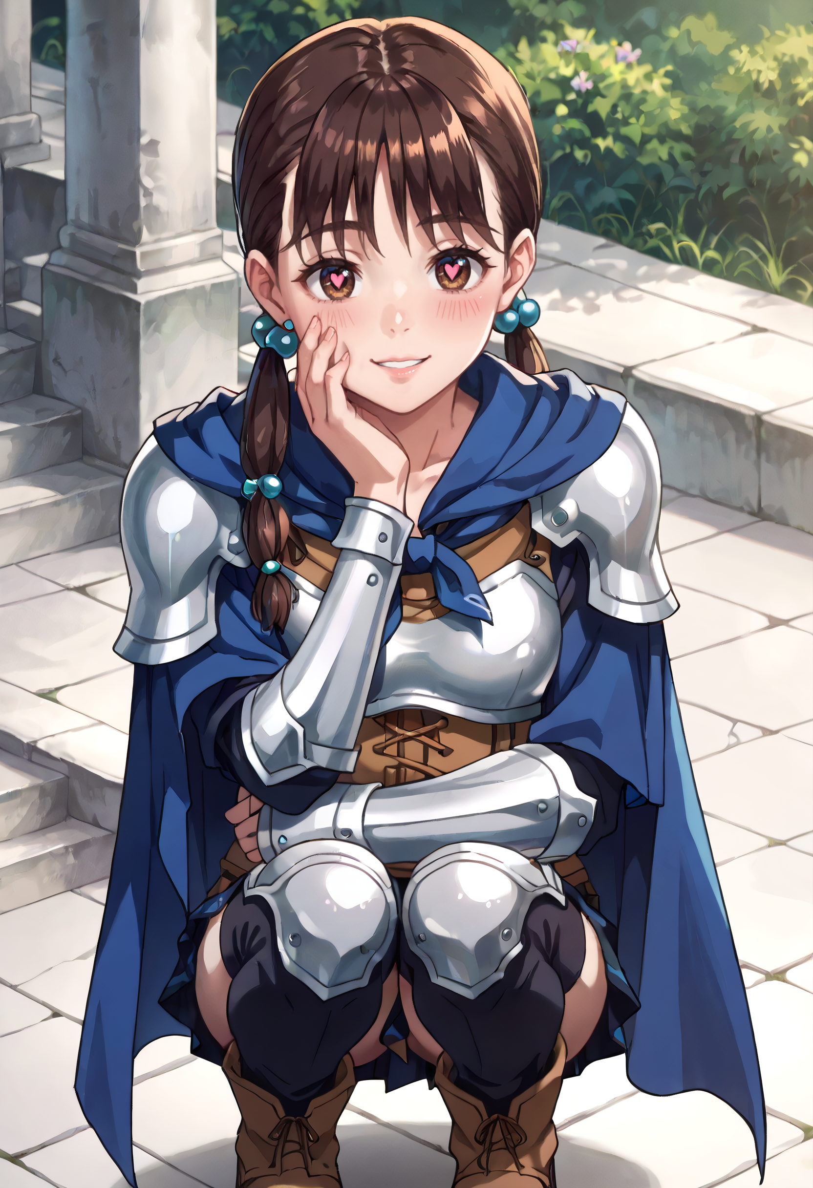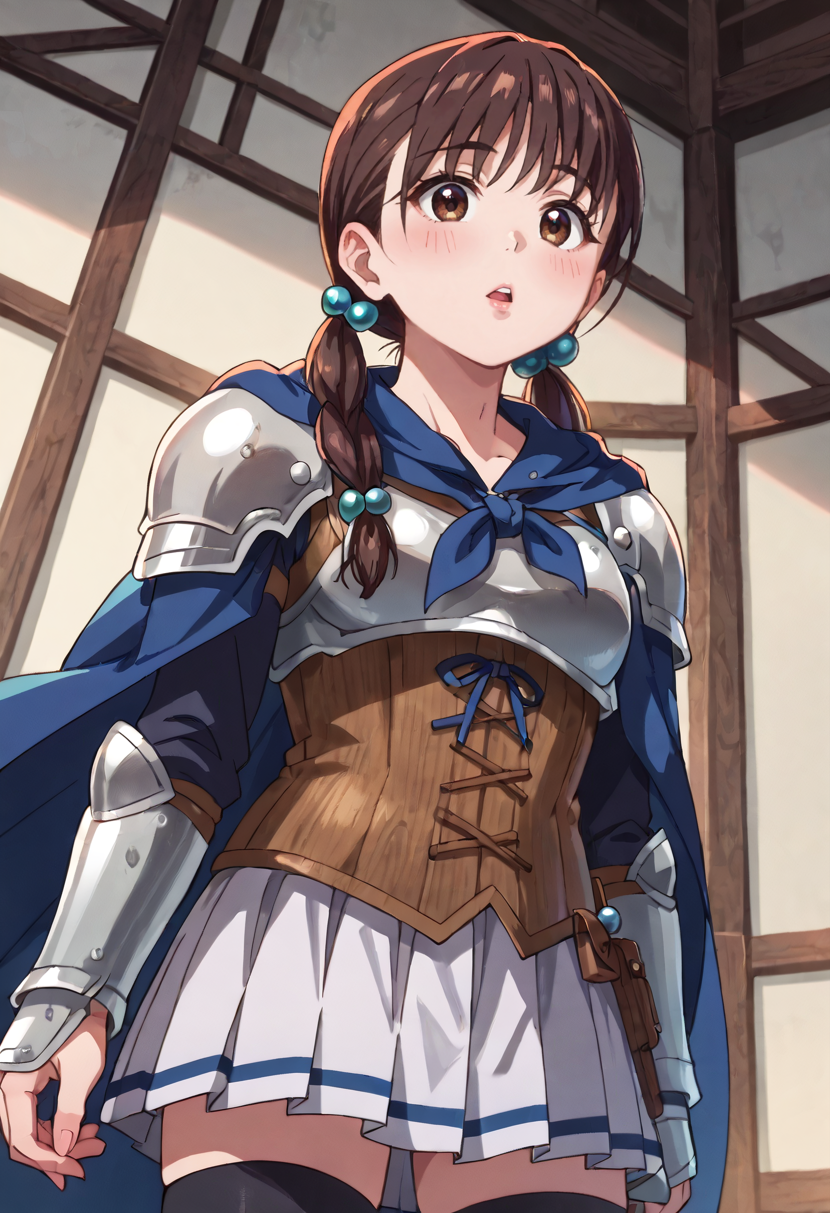 KanouArmor、スカート、イヤリング、ジュエリー、アーマー、髪飾り、セーラー服、ハイソックス、肩アーマー、シャツ、リボン、パウルドロン、ブラックレッグウェア、青いマント、マント、胸当て、ショルダーパッド、コルセット、ブーツ、プリーツスカート、アーマードレス、