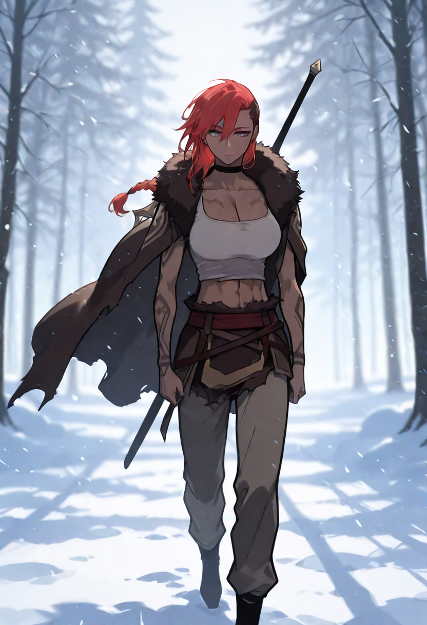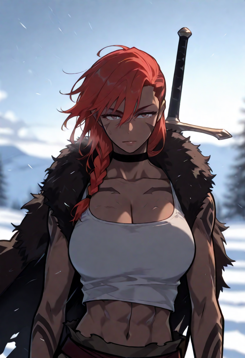 | トレーニングワード | ericaranke, 1girl, solo, long hair, red hair, braided ponytail, single braid, asymmetrical hair, dark skin, dark-skinned female, hair between eyes, brown eyes,コピーしました! fur trim, white tank top, large breasts, navel, cleavage, black choker, midriff, pants, crop top, muscular, tattoo, scar, abs, scar on face, muscular female, arm tattoo, weapon on back, cape,コピーしました! |