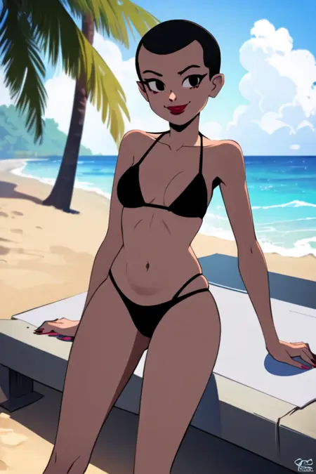 1girl, solo, black hair, short hair, black eyes, makeup, evil smile, small breast
