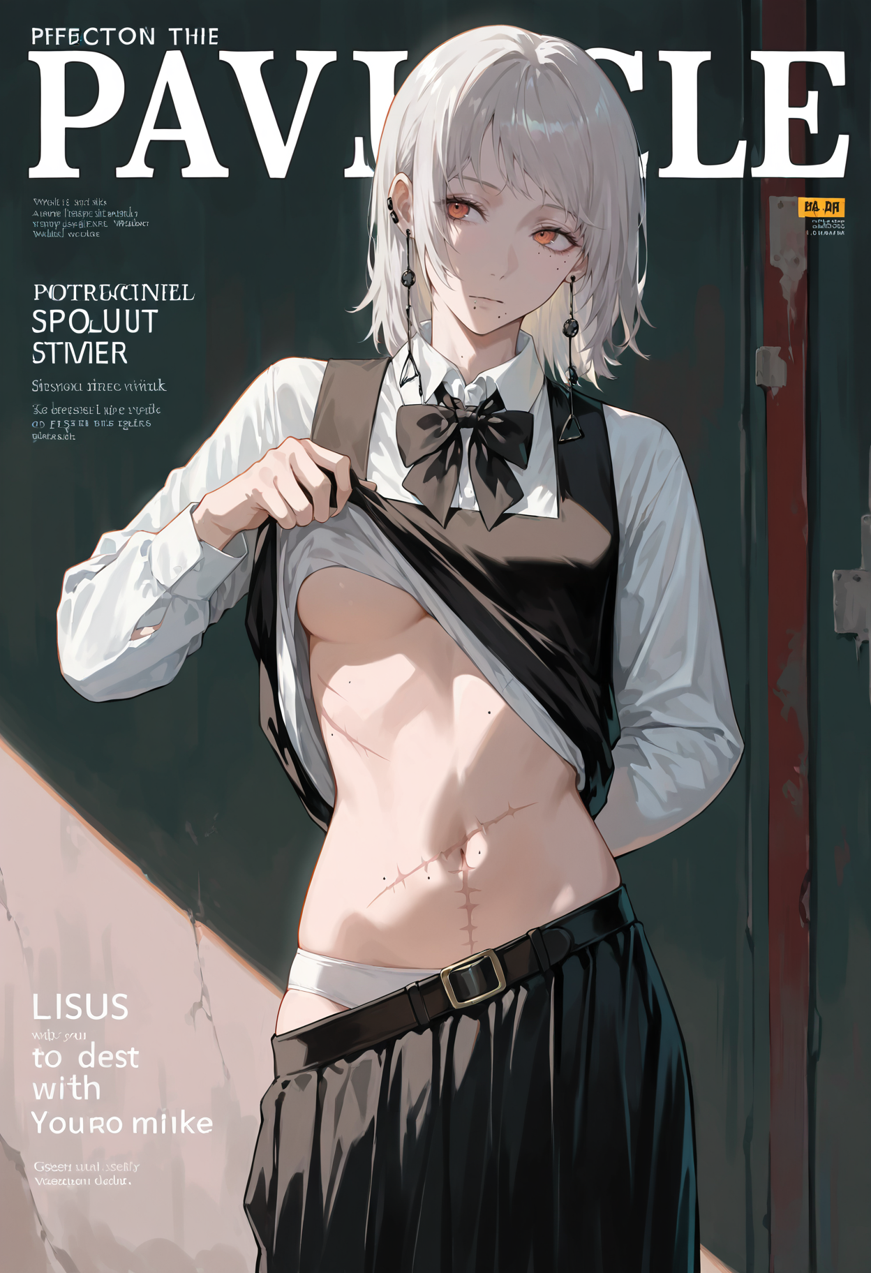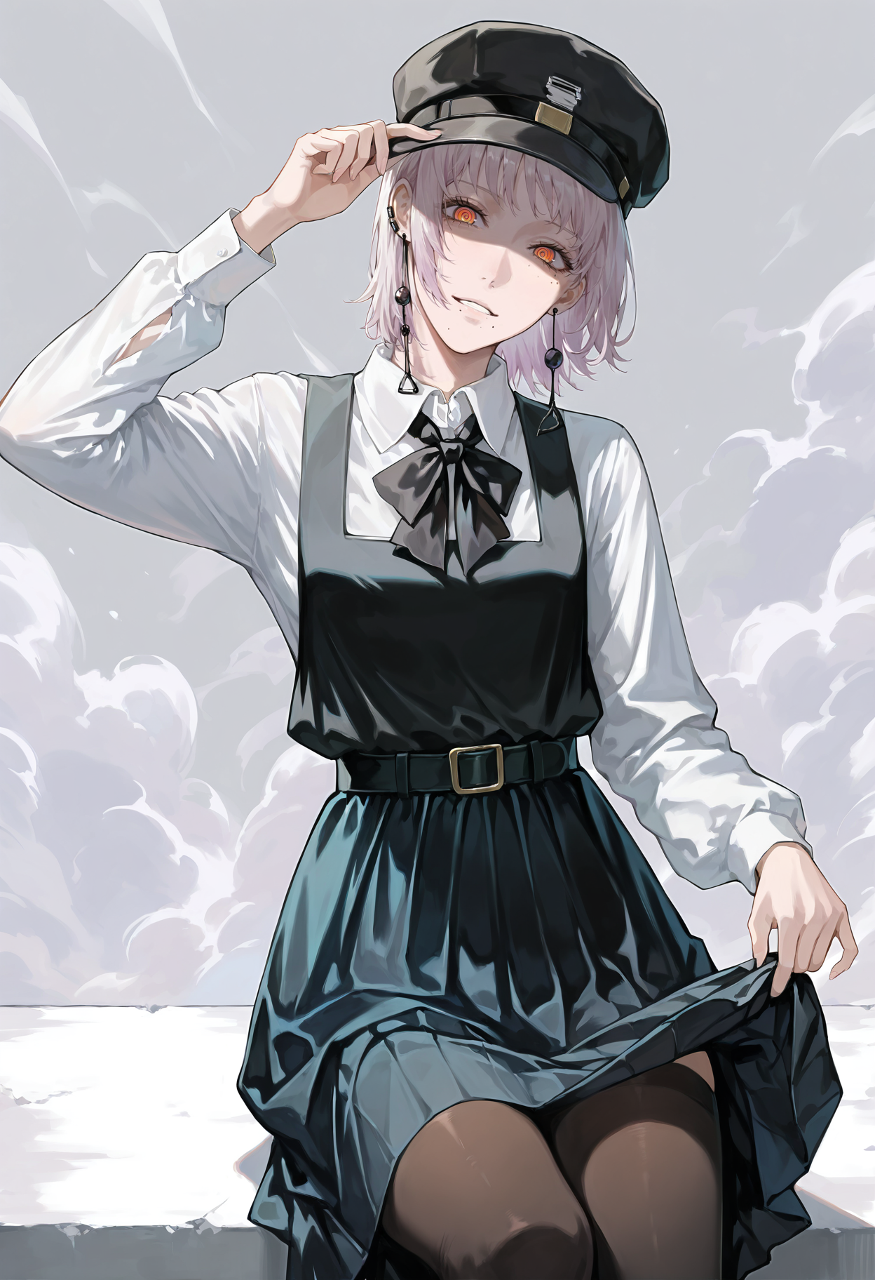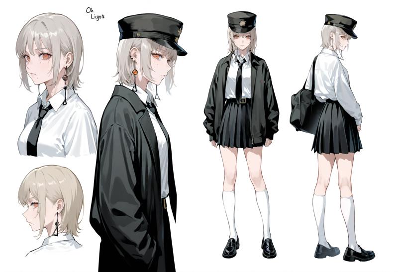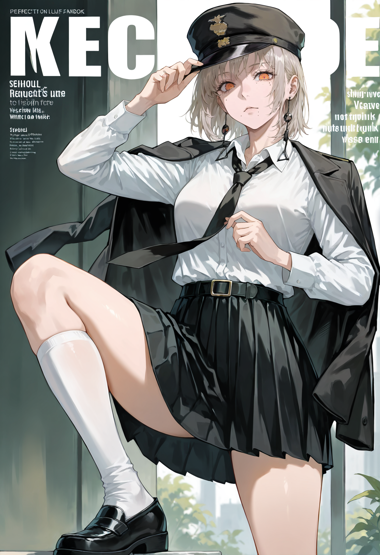 중간 길이 머리, 눈 사이 머리, 옆머리, 모자, 군용 모자, 귀걸이, 치마, 넥타이, 재킷, 셔츠, 검은 목장식, 검은 재킷, 흰 하의, 흰 셔츠, 신발, 검은 치마, 주름 치마, 검은 신발, 검은 머리장식, 보석, 양말, 칼라 셔츠, 학교 유니폼, 긴 소매, 로퍼, 열린 재킷, 열린 옷, 셔츠를 넣음, 무릎 길이 양말, 미니 치마, 대체 복장, 드레스 셔츠, 날개 칼라, 검은 코트, 벨트, 가슴, 열린 코트, 느슨한 넥타이, 어깨에 걸친 재킷