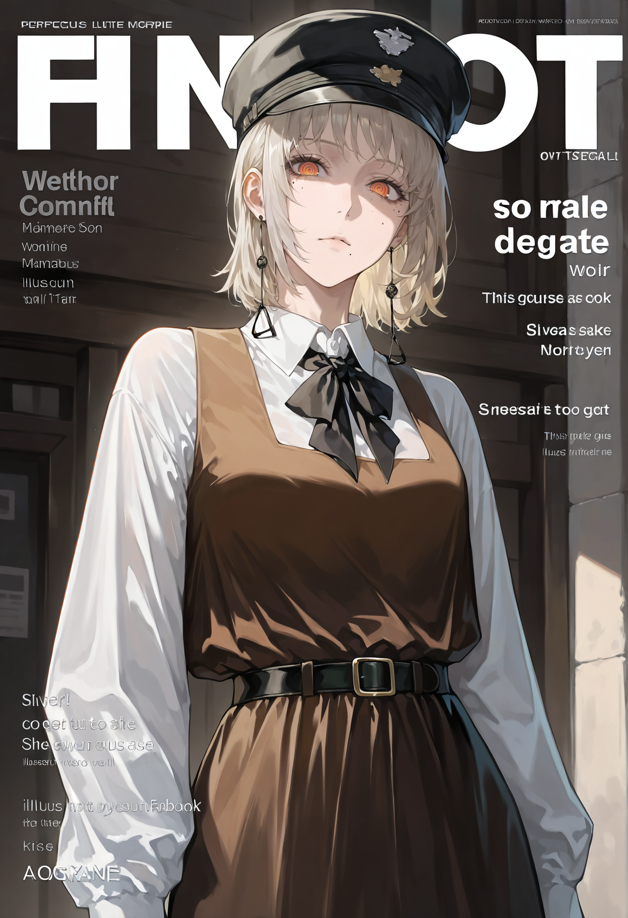 중간 길이 머리, 모자, 뾰족한 모자, 모자 리본, 귀걸이, 보석, 셔츠, 긴 소매, 흰 셔츠, 벨트, 칼라 셔츠, 드레스, 앞치마 드레스, 리본, 검은 목장식, 리본, 목 리본, 어깨 없는, 주름 치마, 검은 리본, 흰 리본, 갈색 드레스, 가슴, 조끼, 어깨 없는 드레스, 버클, 벨트 버클, 대체 복장, 검은 드레스, 중간 크기 가슴, 갈색 조끼, 넥타이, 셔츠를 넣음, 검은 조끼