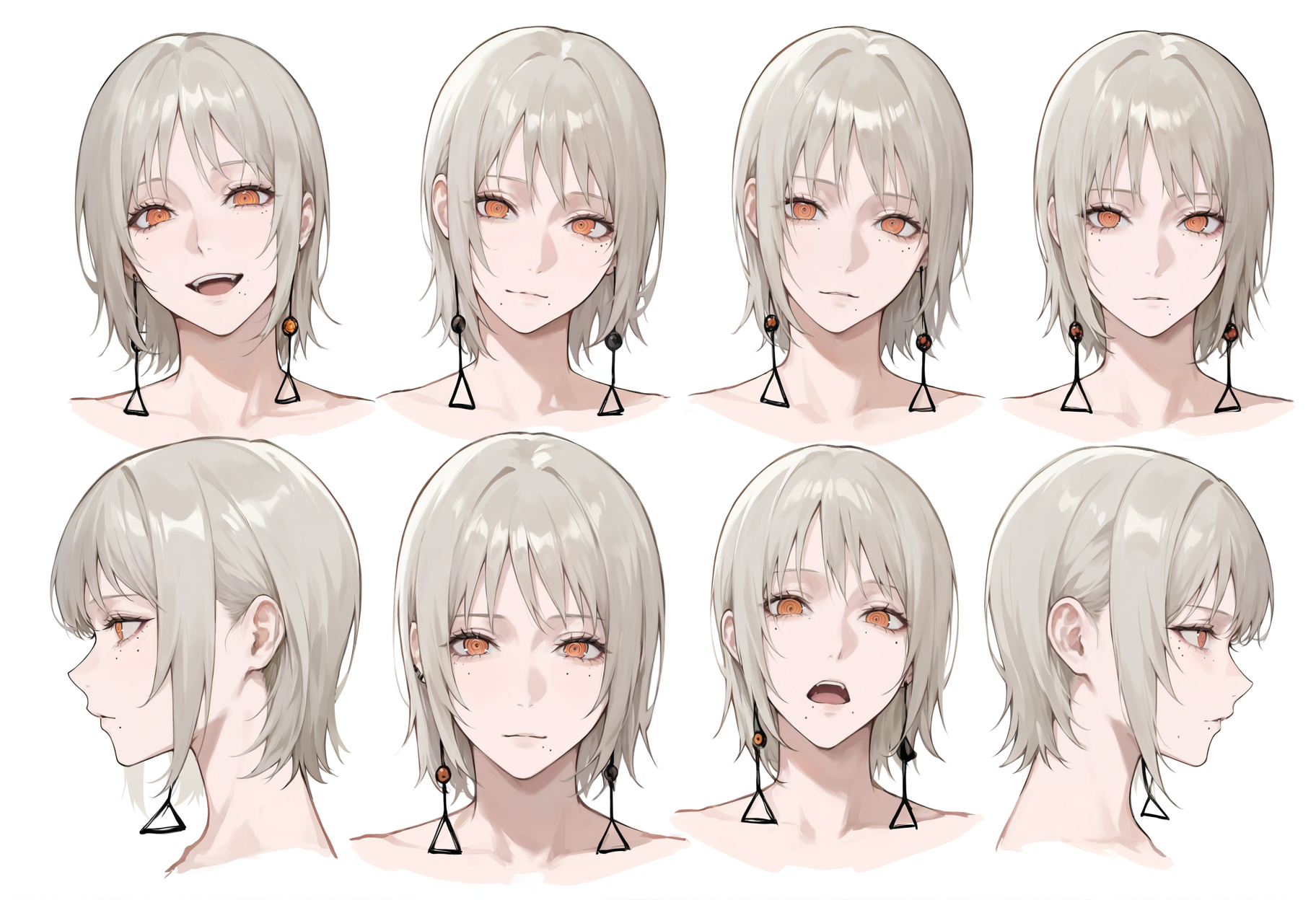 1소녀, 빨간 눈, 주황색 눈, 링 모양 눈, 점, 입 아래 점, 눈 밑 점, 볼 점, 회색 머리, 금발, 연한 갈색 머리, 은색 머리, 갈색 눈, 단발, 앞머리, 옆머리