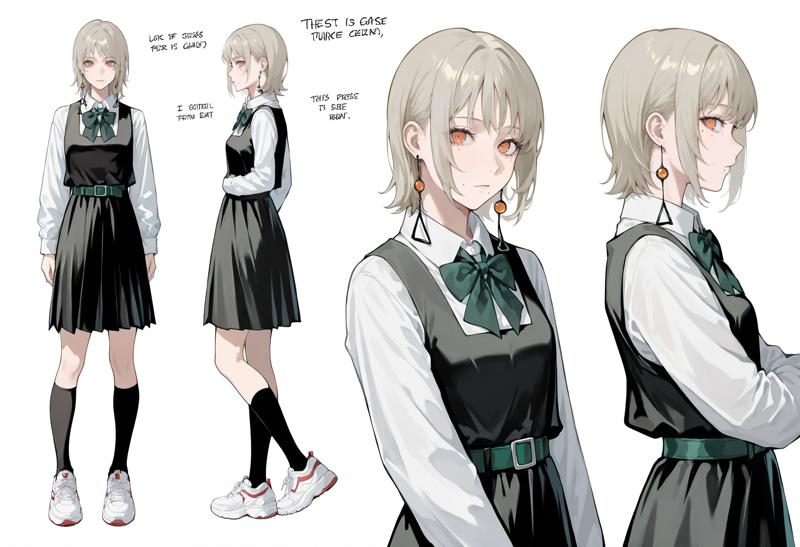 신발, 셔츠, 긴 소매, 검은 하의, 흰 셔츠, 벨트, 흰 신발, 스니커즈, 치마, 양말, 칼라 셔츠, 주름 치마, 학교 유니폼, 회색 치마, 조끼, 중간 길이 머리, 치마 아래 반바지, 무릎 길이 양말, 검은 목장식, 리본, 벨트 버클, 드레스, 앞치마 드레스, 검은 반바지, 검은 치마, 리본, 목 리본, 날개 칼라, 넥타이, 보석, 귀걸이, 검은 드레스, 녹색 벨트, 검은 리본, 검은 벨트, 드레스 셔츠, 가슴, 어깨 없는 드레스, 녹색 리본, 작은 가슴, 회색 목장식, 셔츠를 넣음