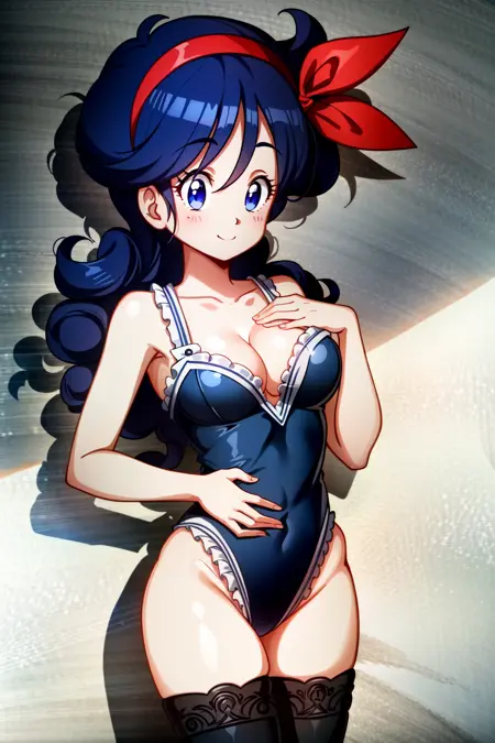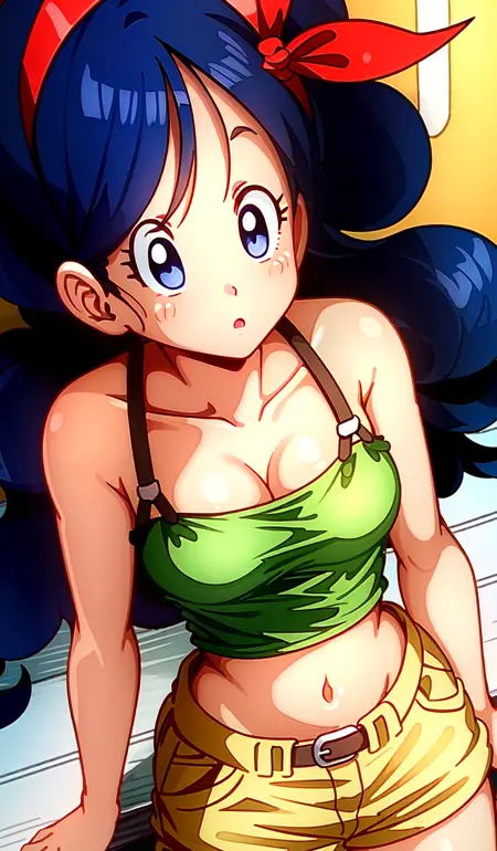 ランチ(ブルーヘア)、ブルーヘア、ロングヘア、リボン、ヘアリボン、笑顔、青い目、カールヘア、ヘアバンド、セクシーな胸元、胸、中くらいの胸、タンクトップ、お腹見せ、クロップトップ、黄色のショートパンツ、短いショートパンツ