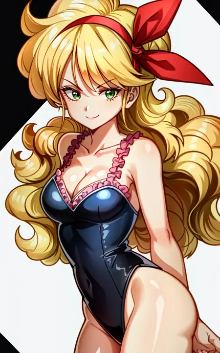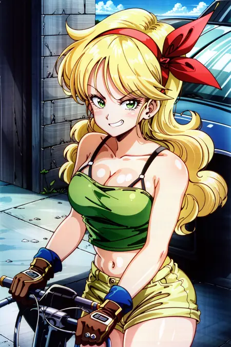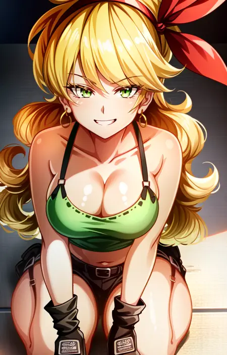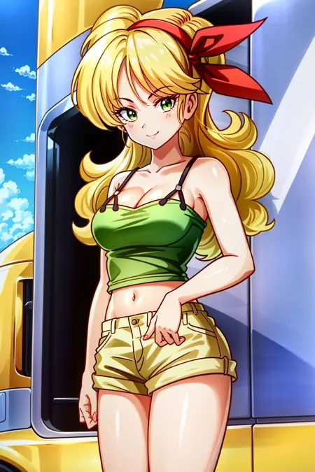 ランチ(ブロンドヘア)、ブロンドヘア、ロングヘア、リボン、ヘアリボン、笑顔、緑の目、カールヘア、ヘアバンド、セクシーな胸元、胸、中くらいの胸、タンクトップ、お腹見せ、クロップトップ、黄色のショートパンツ、短いショートパンツ